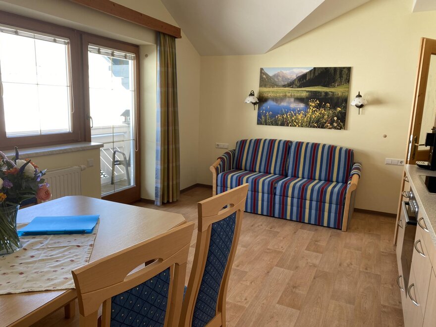 ca. 40 m² für 2-3 PersonenDas Appartement Enzian verfügt über ein Schlafzimmer, WC und Dusche getrennt und eine komplett eingerichtete Wohnküche mit einer Ausziehcouch und einem Balkon in Blickrichtung Westen.