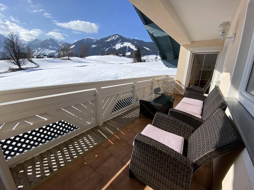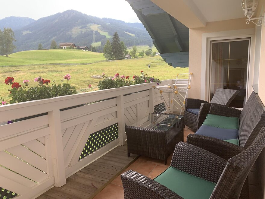 Der große Balkon bietet Platz für die ganze Familie und ist ebenfalls mit einem großen Esstisch sowie Stühlen ausgestattet.