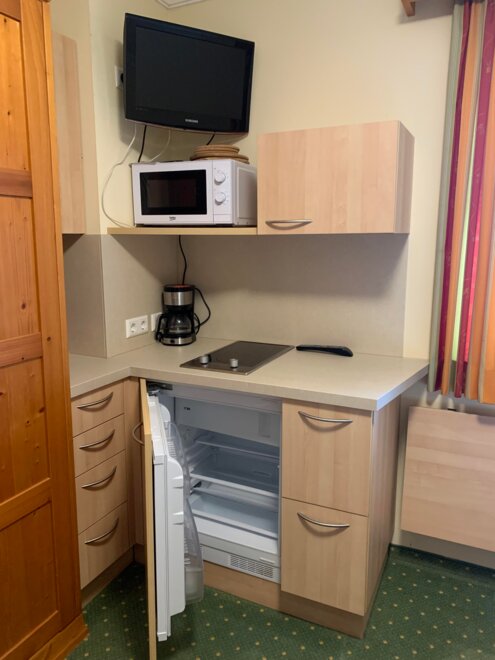 Das Doppelzimmer inkl. Dusche/WC verfügt über eine kleine Kochnische inkl. Kühlschrank.
