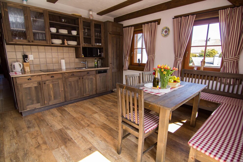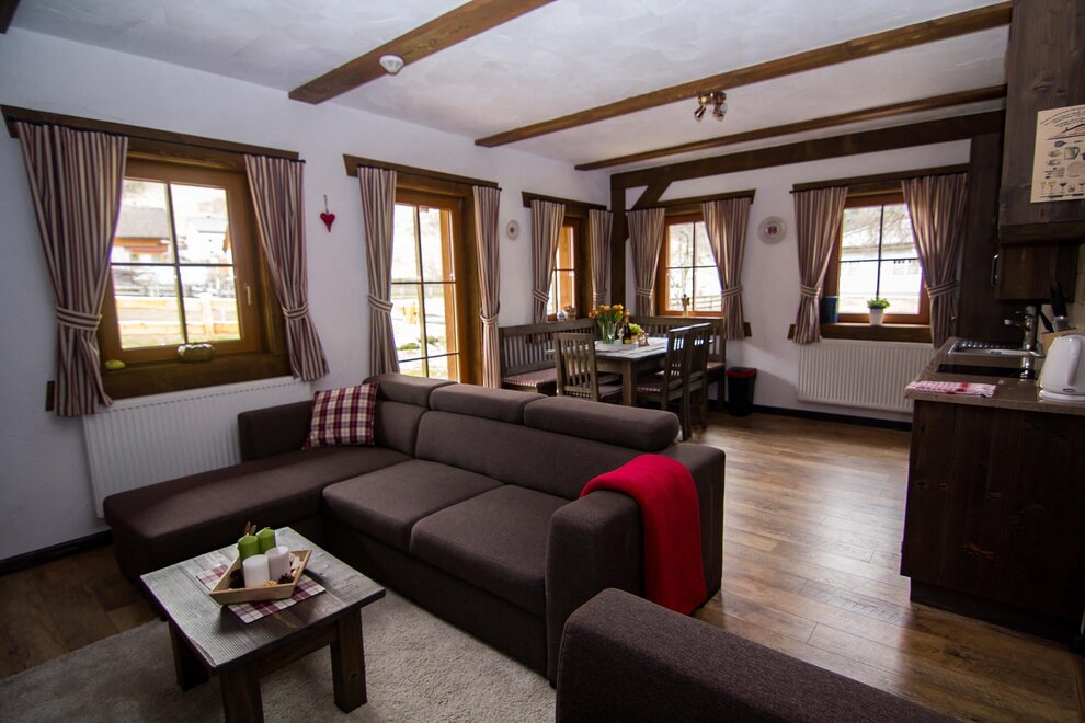 - Wohnzimmer mit Essecke und Küche, im WZ eine Schlafcouch für zwei Personen