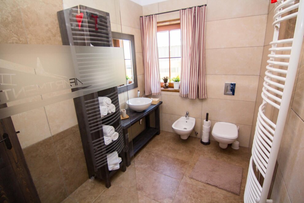 - Basisausstattung Bad: Handseife, Klohpapier, Handtücher, Bidet