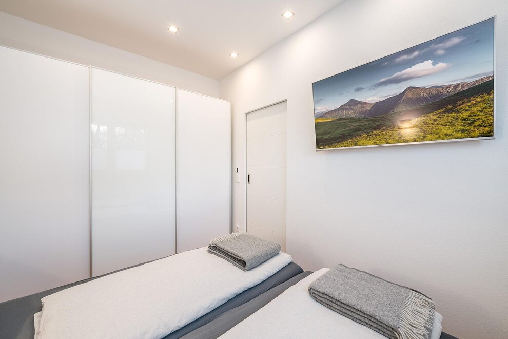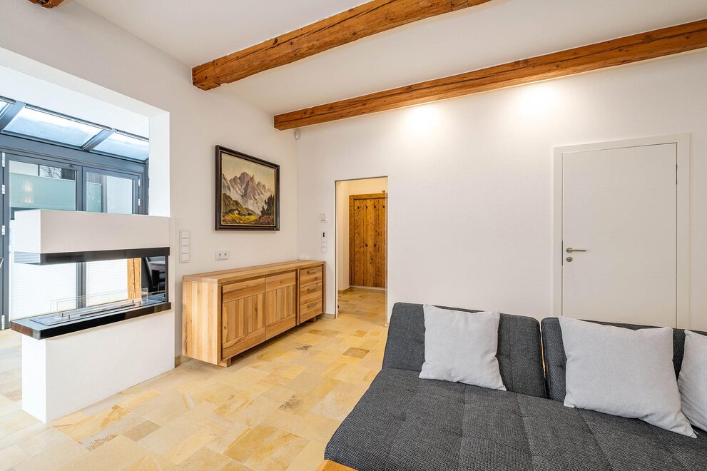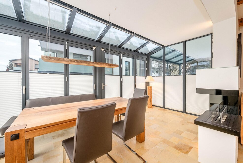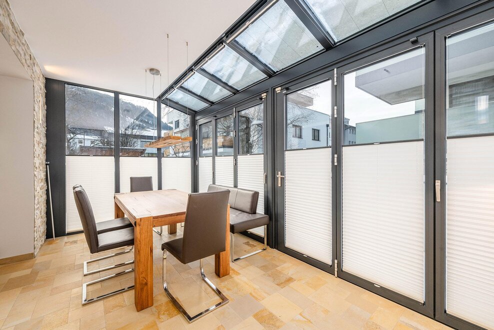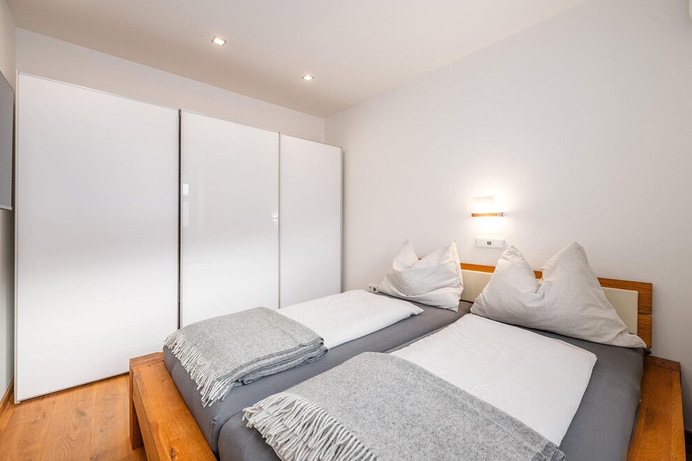 Auf 64 m² Wohnfläche bietet das Apartment Platz für bis zu 5 Personen. Zwei getrennte Schlafzimmer mit jeweils einem 180 cm Doppelbett sorgen für höchsten Schlafkomfort, ergänzt durch ein Schlafsofa im Wohn- und Essbereich. Der lichtdurchflutete Wintergarten mit Essbereich verbindet Innen- und Außenraum auf elegante Weise, während die private Terrasse zum Entspannen nach einem aktiven Tag in den Bergen einlädt.