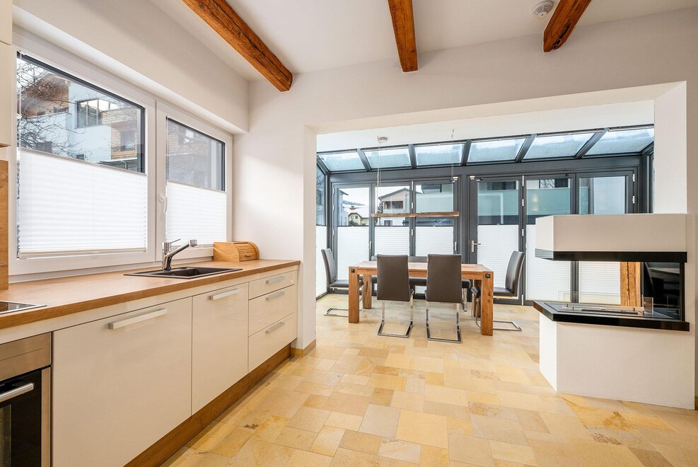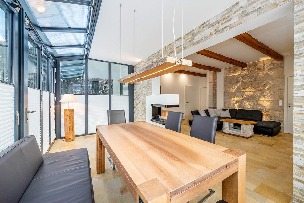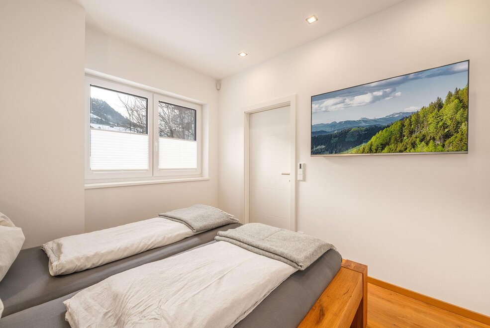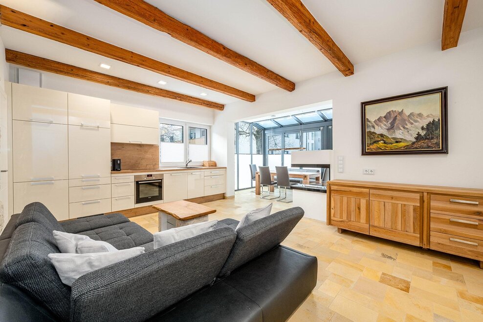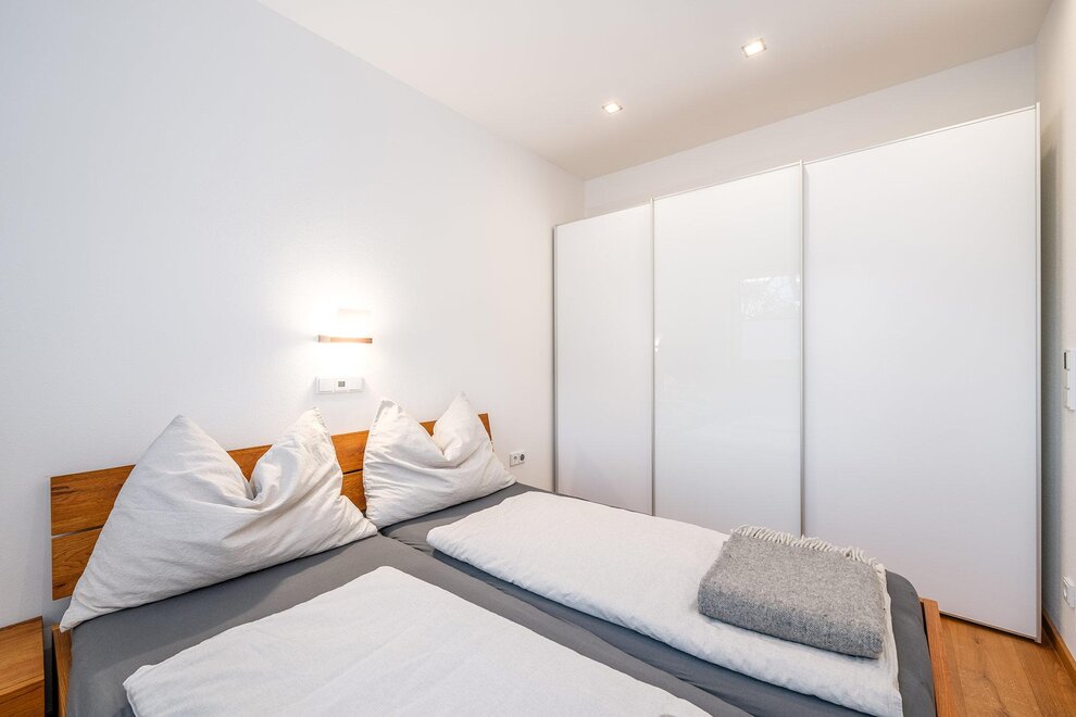 Auf 64 m² Wohnfläche bietet das Apartment Platz für bis zu 5 Personen. Zwei getrennte Schlafzimmer mit jeweils einem 180 cm Doppelbett sorgen für höchsten Schlafkomfort, ergänzt durch ein Schlafsofa im Wohn- und Essbereich. Der lichtdurchflutete Wintergarten mit Essbereich verbindet Innen- und Außenraum auf elegante Weise, während die private Terrasse zum Entspannen nach einem aktiven Tag in den Bergen einlädt.