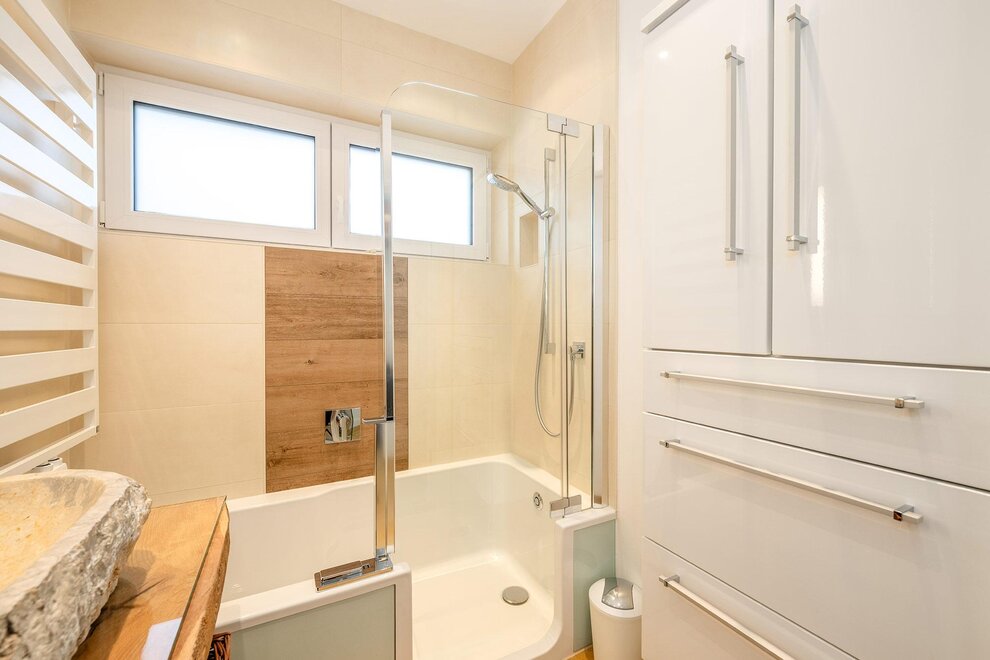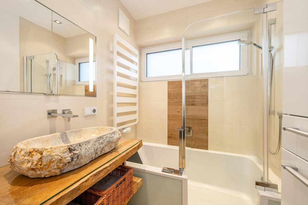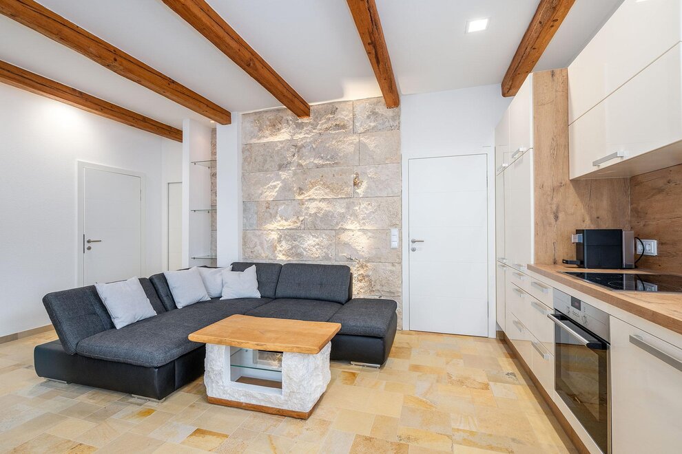 Das großzügige Badezimmer ist mit Badewanne/Dusche ausgestattet, wobei die begehbare Badewanne auch für Personen mit eingeschränkter Mobilität geeignet ist. Ein separates WC sorgt für zusätzlichen Komfort. Die hochwertig ausgestattete Wohnküche sowie ausgewählte Designmöbel unterstreichen den exklusiven Charakter des Apartments.