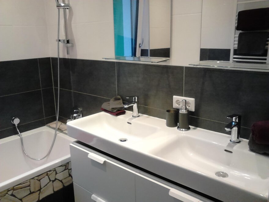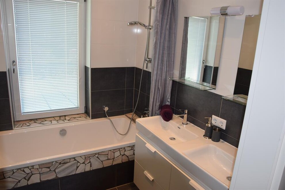 Das Appartement besteht aus 2 Schlafzimmern: Schlafzimmer 1 : Doppelbett (180 cm), Schlafzimmer 2: Doppelbett (160 cm) und Hochetage mit Doppelbett (140cm) mit je 2 Betten. Zu jedem Schlafzimmer gehört ein Bad. Ein Bad ist ausgestattet mit einer Dusche, WC, Doppelwaschbecken und Waschmaschine. Das zweite Bad ist ausgestattet mit einer Badewanne, WC und einem Doppelwaschbecken. Wohnzimmer mit Couch für 2 Personen