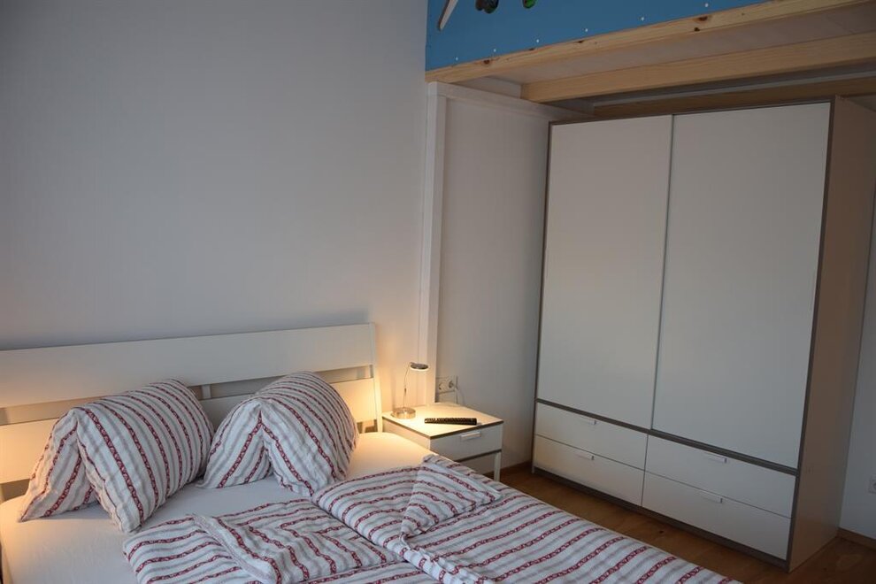 Das zweite Schlafzimmer hat ebenfalls ein Doppelbett und zusätzlichem Doppelhochbett (140 cm Breite), Sat-TV gehört auch zur Ausstattung.