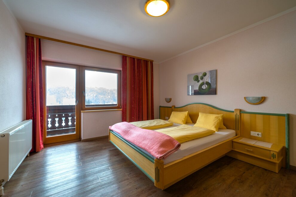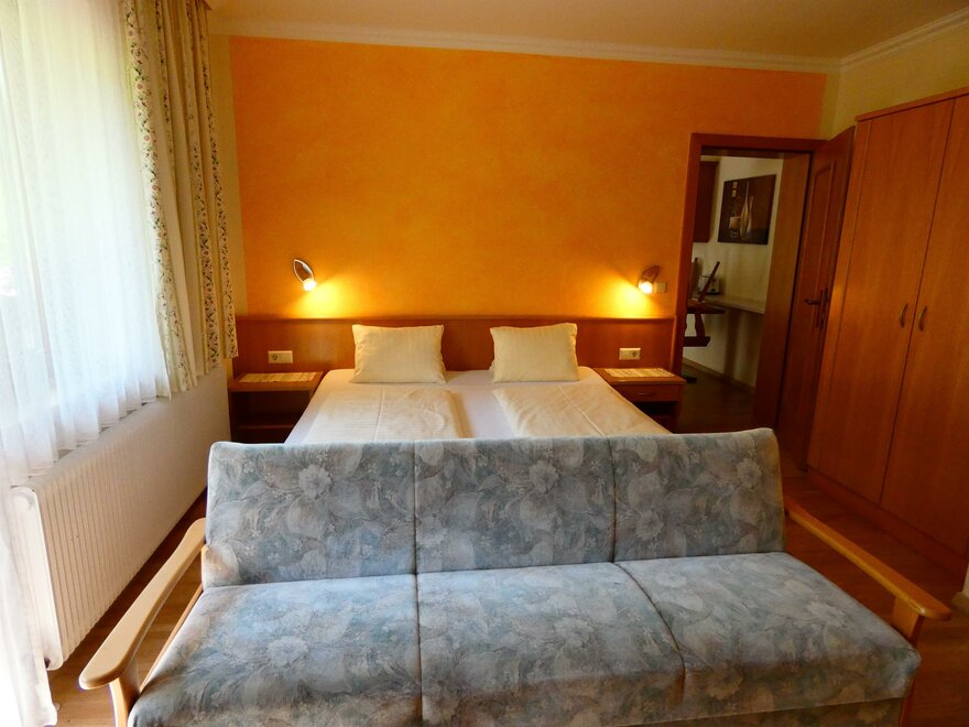 Appartement Planai (45m²) 2 - 5 PersonenDas Schlafzimmer mit Blickrichtung Süden bietet ein gemütliches Doppelbett mit einer zusätzlichen Schlafcouch für 1 Person.