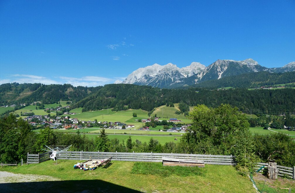 Appartement Scheichenspitz (45m²) 2 - 5 PersonenDas Schlafzimmer mit Blick auf das Dachstein Gebirge bietet ein Doppelbett mit zusätzlich einer Schlafcouch für 1 Person.