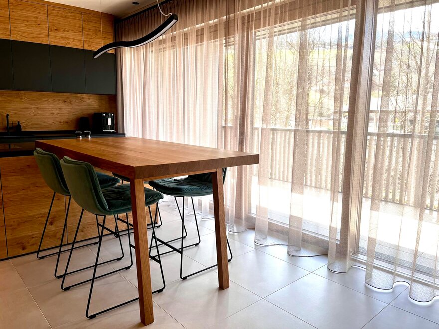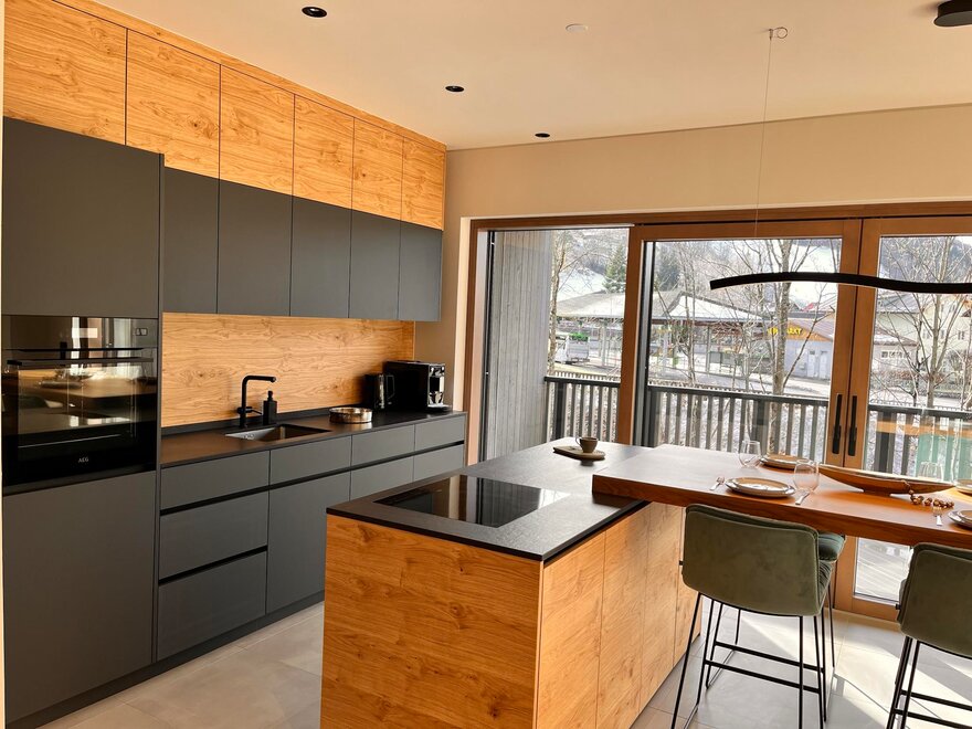 Die Küche ist modern und zeitgemäß ausgestattet. Sie verfügt über alle wichtigen Geräte, wie Herd, Backofen, Kühlschrank, Kaffeemaschine und Geschirrspüler.