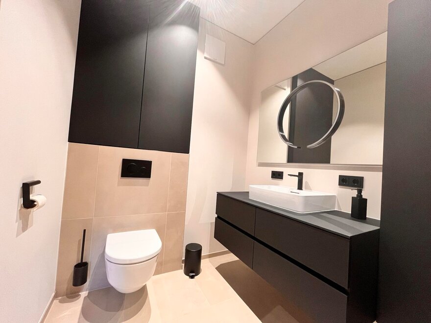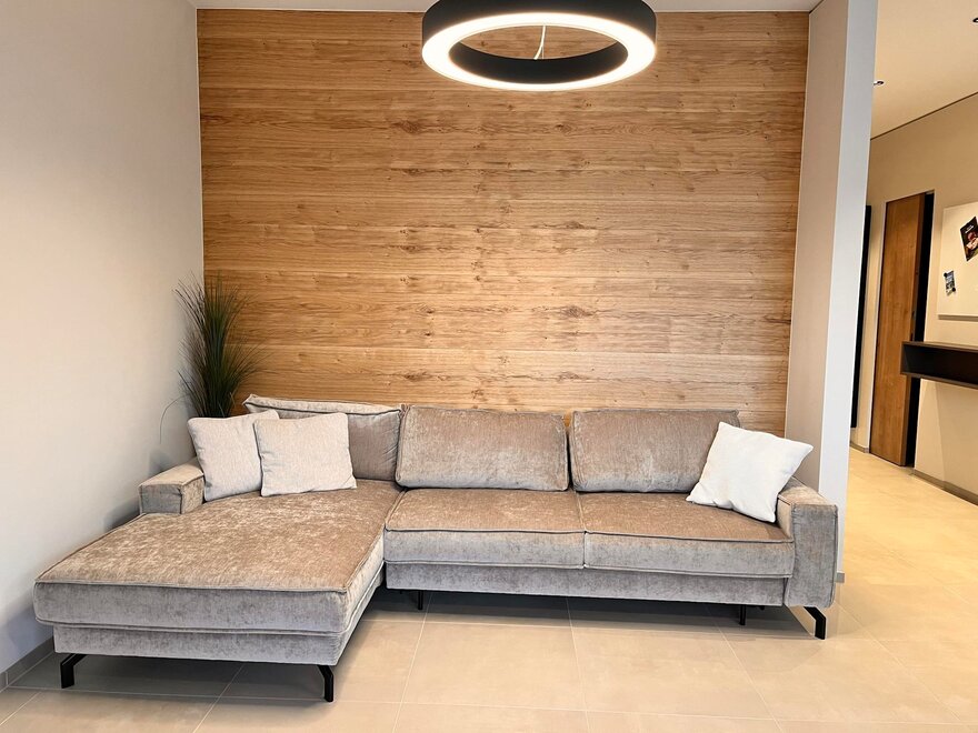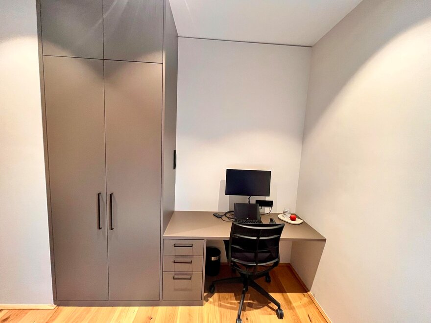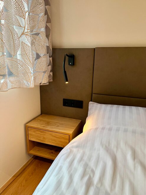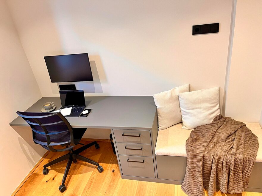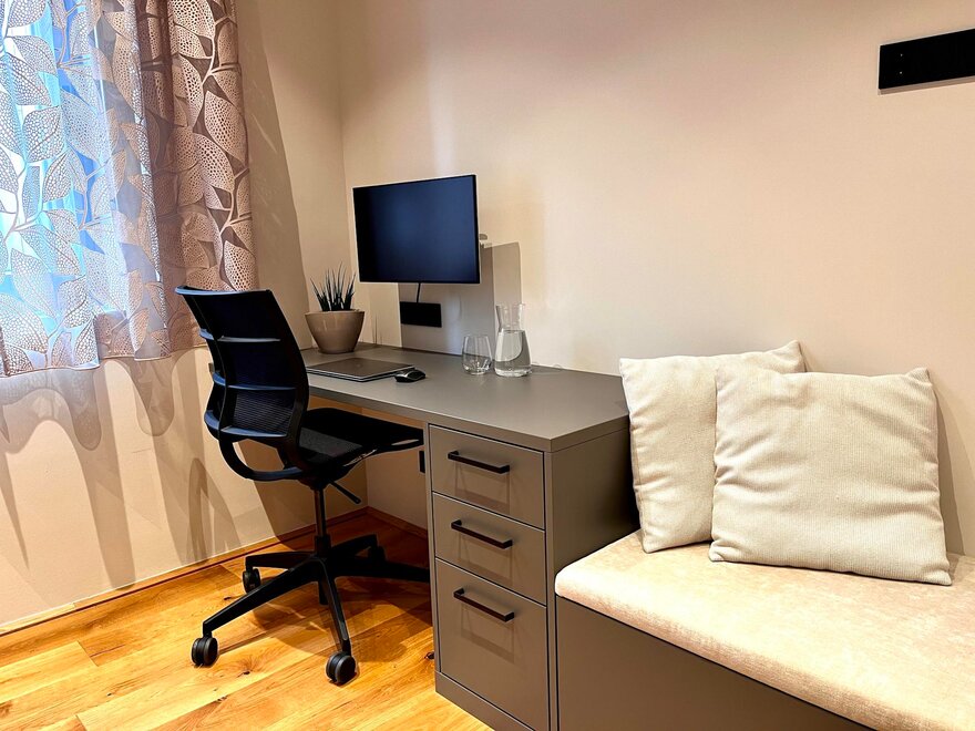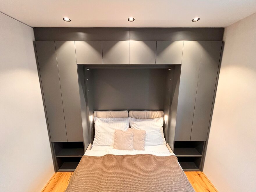 Ein Schlafzimmer ist mit einem Doppelbett und einem geräumigen Kleiderschrank ausgestattet. Das zweite Schlafzimmer verfügt über ein transformables Doppelbett/Sofa. Sie können je nach Bedarf Platz schaffen und am Abend das Sofa in ein Doppelbett umwandeln. Seitlich des Bettes befindet sich jeweils ein Kleiderschrank.
