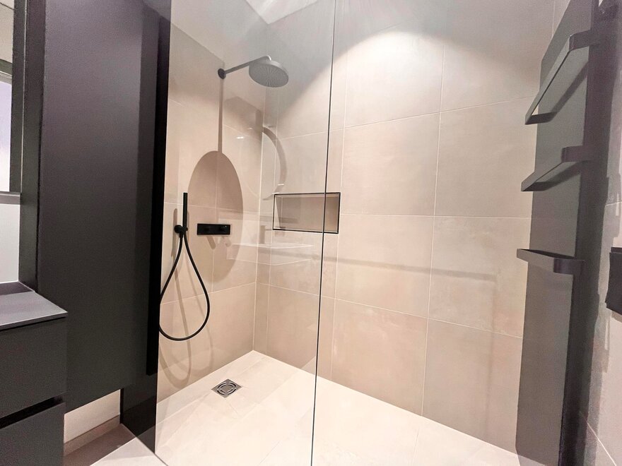 Das Badezimmer verfügt über eine Dusche, Handtücher, Fön, Toilette und Waschbecken.