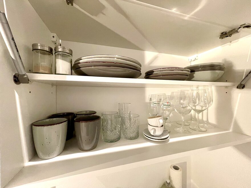 Appartement hochwertige Ausstattung, Kingsize Bett, Schrank, Küchenzeile mit Geschirrspüler, Kühlschrank mit Gefrierfach, Herd mit Backofen, die Küche ist mit hochwertigen Küchenutensilien ausgestattet, Geschirrtücher vorhanden, 1 x Bettzeug und jeweils 1 Garnitur Handtücher im Preis enthalten, Bad mit Dusche und WC, Flachbild TV, WLAN kostenfrei, kleiner Tisch mit 2 Stühlen, Schuhablage, Garderobe, Tisch und 4 Stühle auf der überdachten Terrasse.