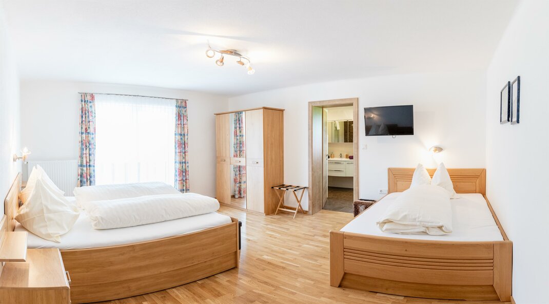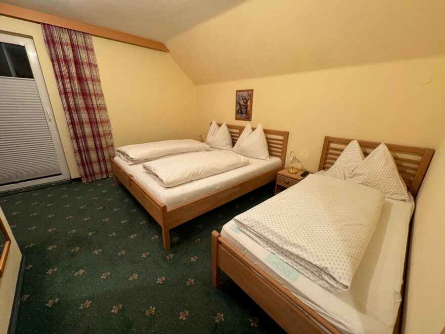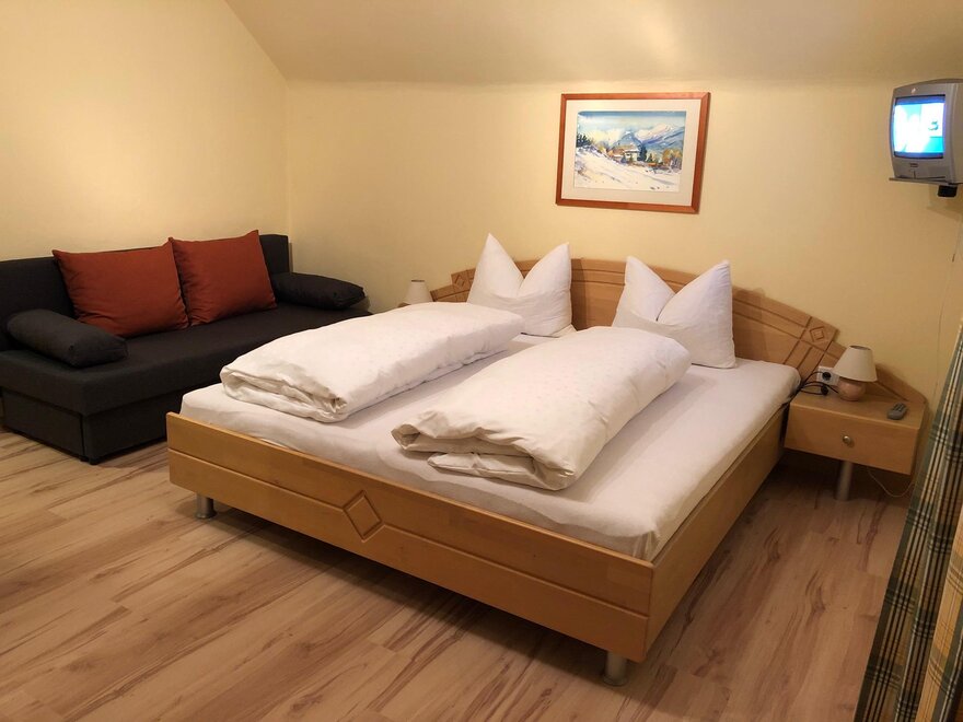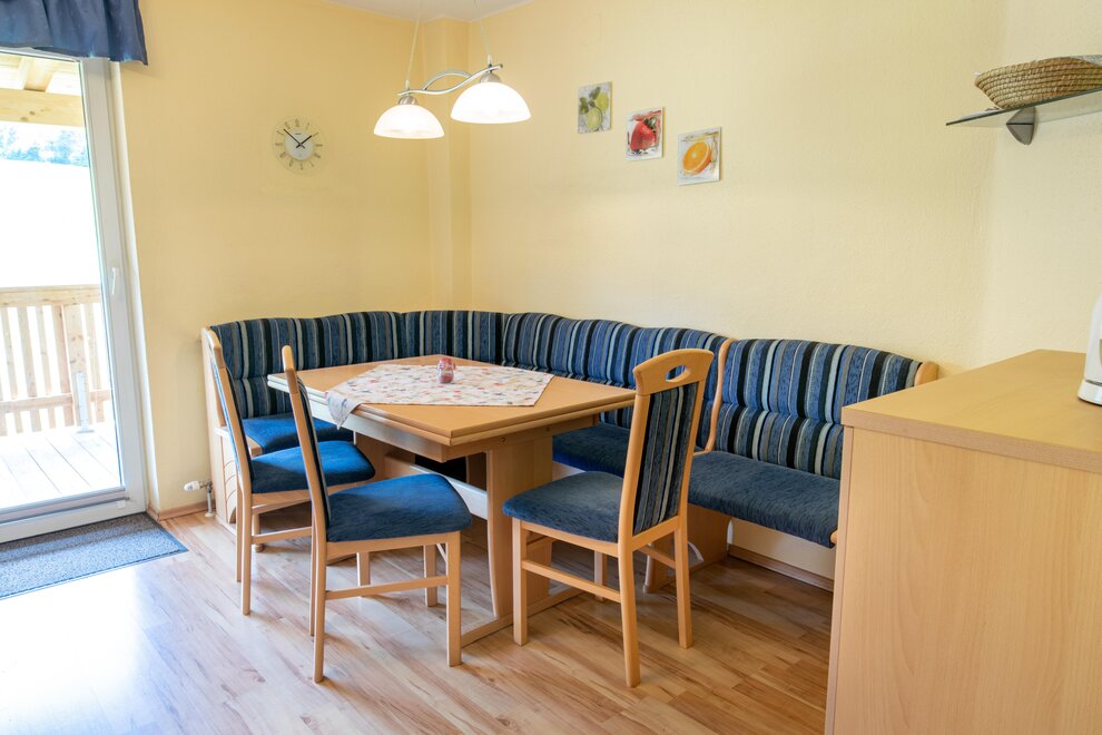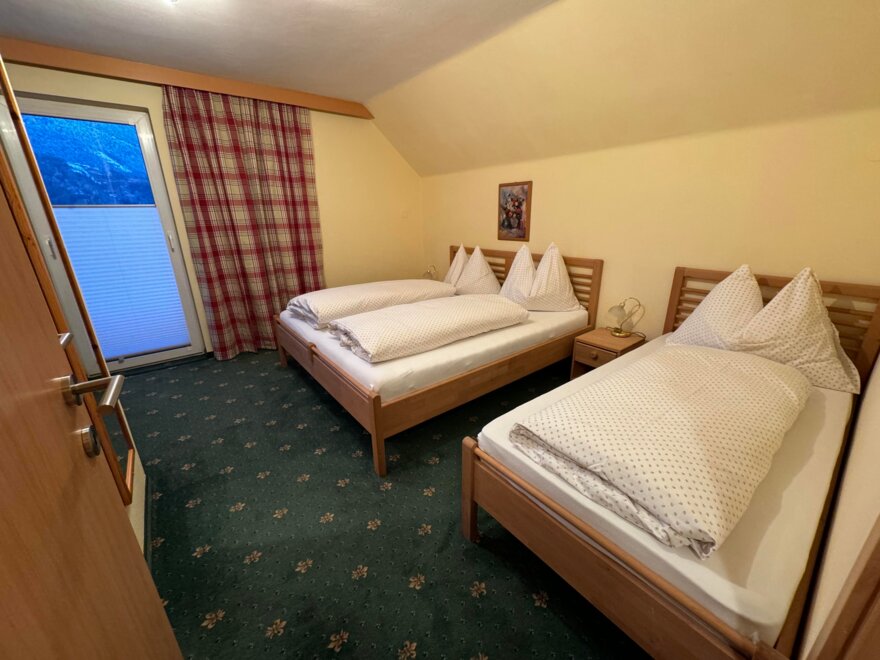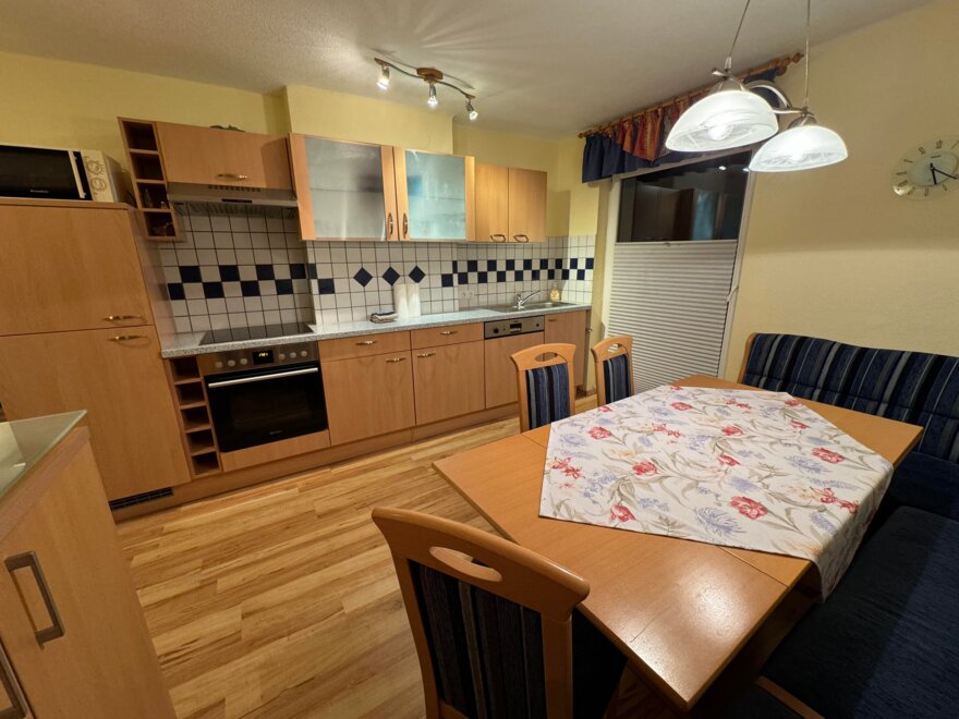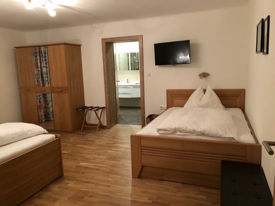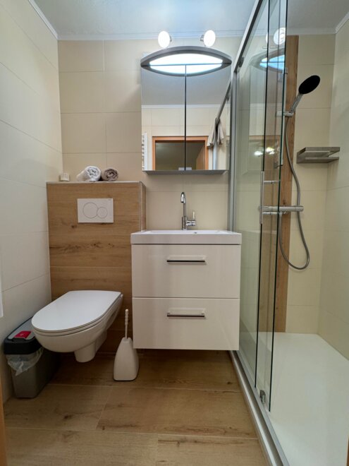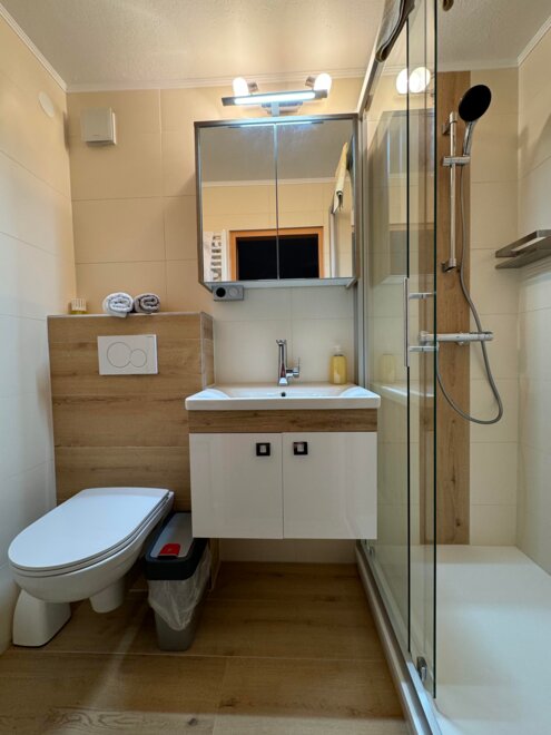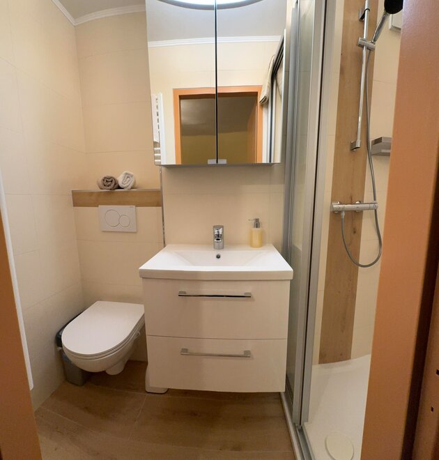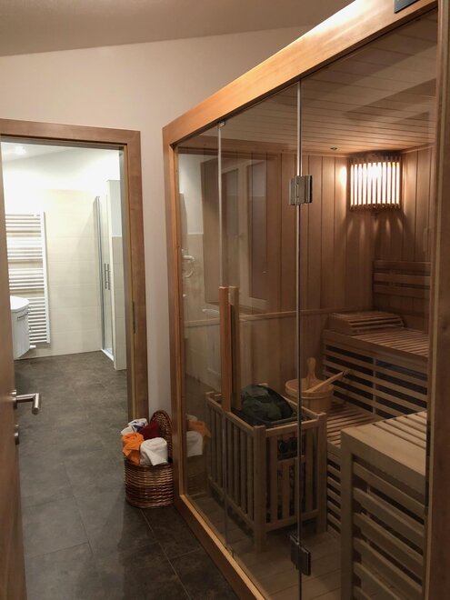 Appartement mit 1 Dreibettzimmer und 2 Doppelzimmer. Jedes Zimmer verfügt über ein eigenes Bad mit Dusche/WC. Für das gemütliche Zusammensein eignet sich die Küche mit Sitzecke. Gratis W-Lan. Eigene Sauna im Appartement.