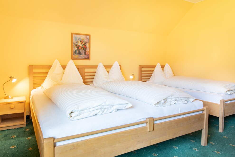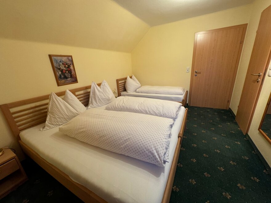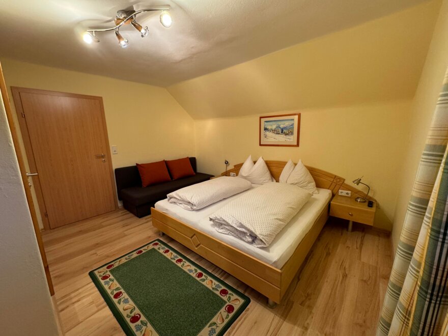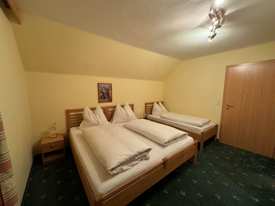 Appartement mit 1 Doppelzimmer und 1 Dreibettzimmer (mit Doppelbett und 1,40 m Bett). Jedes Zimmer verfügt über ein eigenes Bad mit Dusche/WC. Die gemeinsame Sauna ist von beiden Zimmer zugänglich. Für das gemütliche Zusammensein eignet sich die Küche mit Sitzecke. Gratis W-Lan.