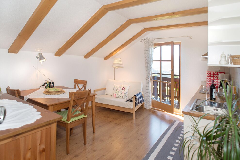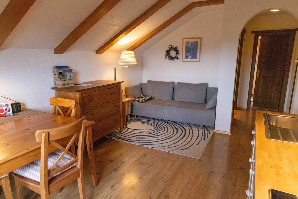 Die "komfortable" Ferienwohnung "Hirsch" für 2 Personen, 2. Stock, Südbalkon, Dusche/WC getrennt, 1 Schlafzimmer, Wohnküche mit Sat-TV und Radio, W-Lan, mit ausziehbarer Couch, läd ein zum entspannten Wohnen und einen herrlichen Ausblick!!