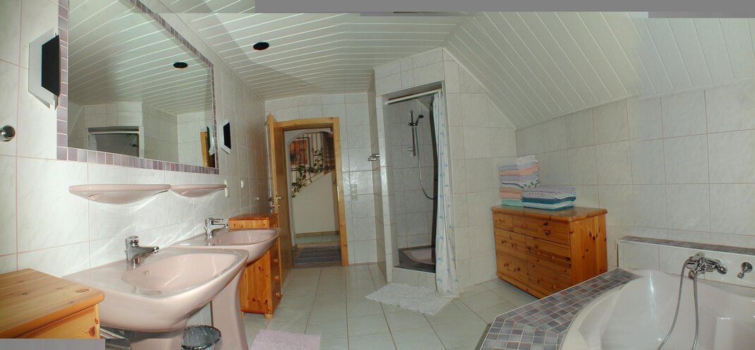 Badewanne, Dusche, Doppelwaschbecken, Separates WC