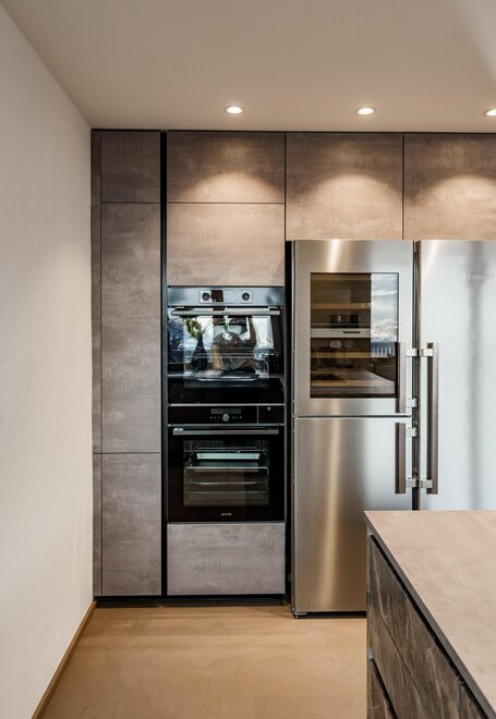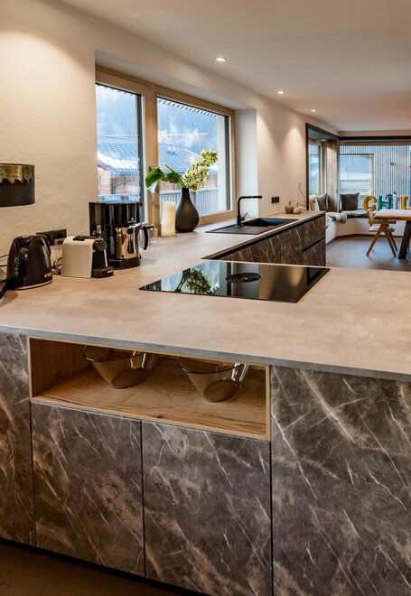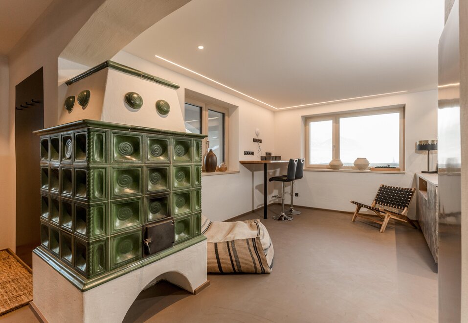 - Eat & Meet & Chill Area mit komplett ausgestatteter Küche, großer Esstisch, XXL Couch, Kachelofen, Medientisch und Smart TV