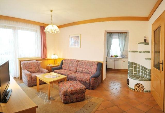 Das Appartement Typ I hat 40 m² und verfügt über einen Wohnraum mit Sitzgruppe (zusätzlich 2 Schlafmöglichkeiten), Sat-TV, Flachbildschirm, Radio, Telefon, Safe, Föhn, Kachelofen, 1 Doppelzimmer mit Dusche und zusätzlich 1 WC getrennt, Bettwäsche und Handtücher, Küche räumlich vom Wohnraum getrennt mit Esstisch, komplett eingerichtet mit Geschirr, E-Herd, Mikrowelle, Geschirrspüler und Kühlschrank, der Balkon bzw. die Terrasse sind nach Süden ausgerichtet.