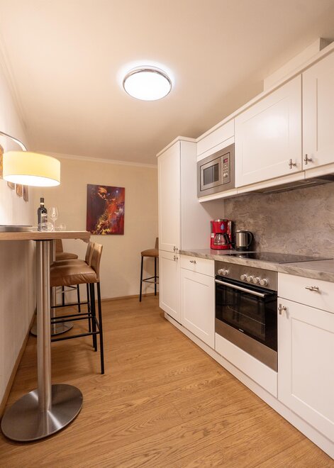 Das Appartement ist 57 m² bis 65 m² groß und verfügt über einen Schlafraum, Wohnschlafraum, Badezimmer, voll ausgestatteten Küchenblick mit