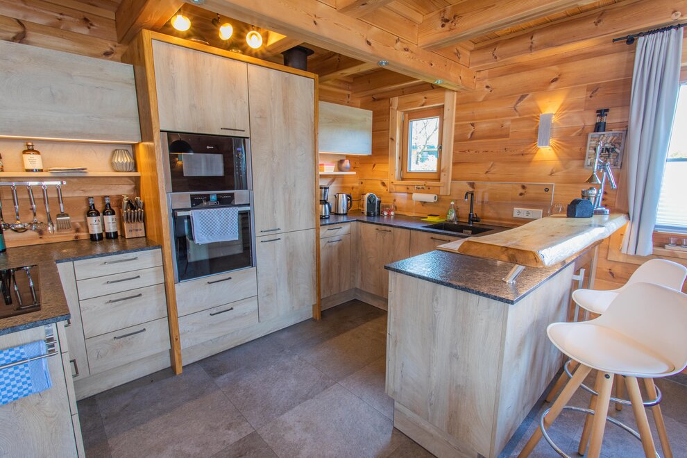 Die offene Küche ist hochwertig ausgestattet – inkl. Weinkühlschrank – und lädt zum gemeinsamen Kochen ein. Der großzügige Wohnbereich mit Kaminofen schafft eine behagliche Atmosphäre. Holz wird bereitgestellt.