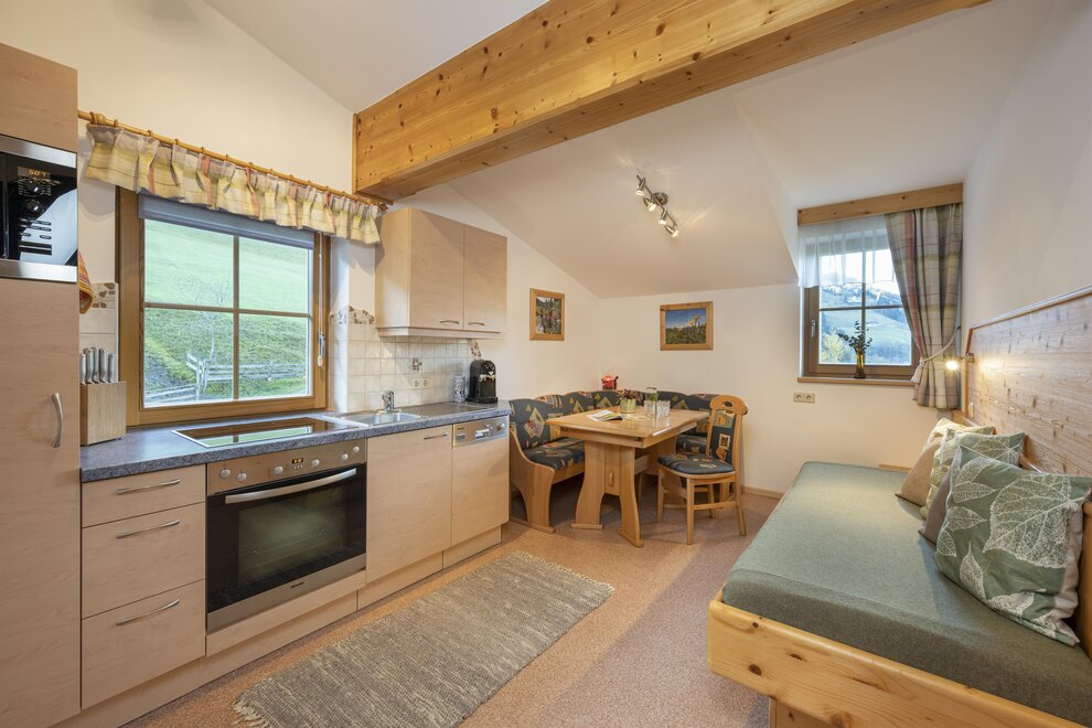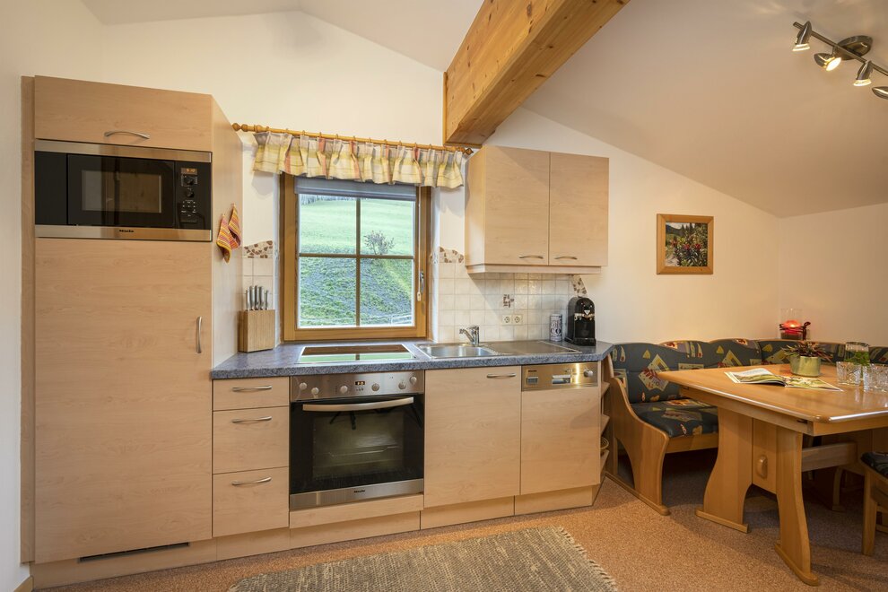 45m² großes Appartement mit Blick Richtung Reiteralm, für 2 bis 3 Personen mit einem Schlafzimmer für 3 Personen und einem Couchbett im Wohnbereich, komplett ausgestattete Wohnküche mit E-Herd und Backrohr, Kühlschrank mit Gefrierfach, Spüle mit Geschirrspüler, Wasserkocher sowie Tabs Kaffeemaschine, Bad mit Dusche, Föhn und separates WC, eigener Eingangsbereich mit Vorraum, W-Lan, TV und auf Wunsch Brötchenservice und frische Milch. Bettwäsche, Handtücher und Geschirrtücher inkludiert.