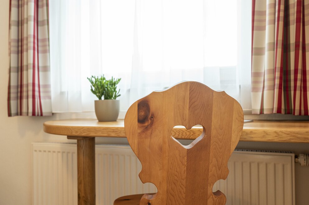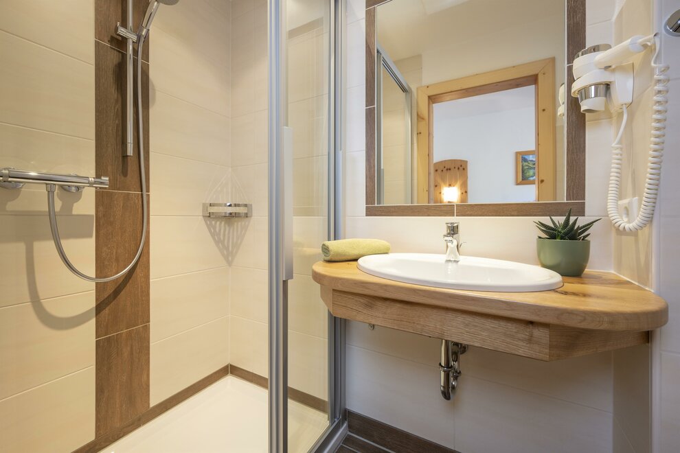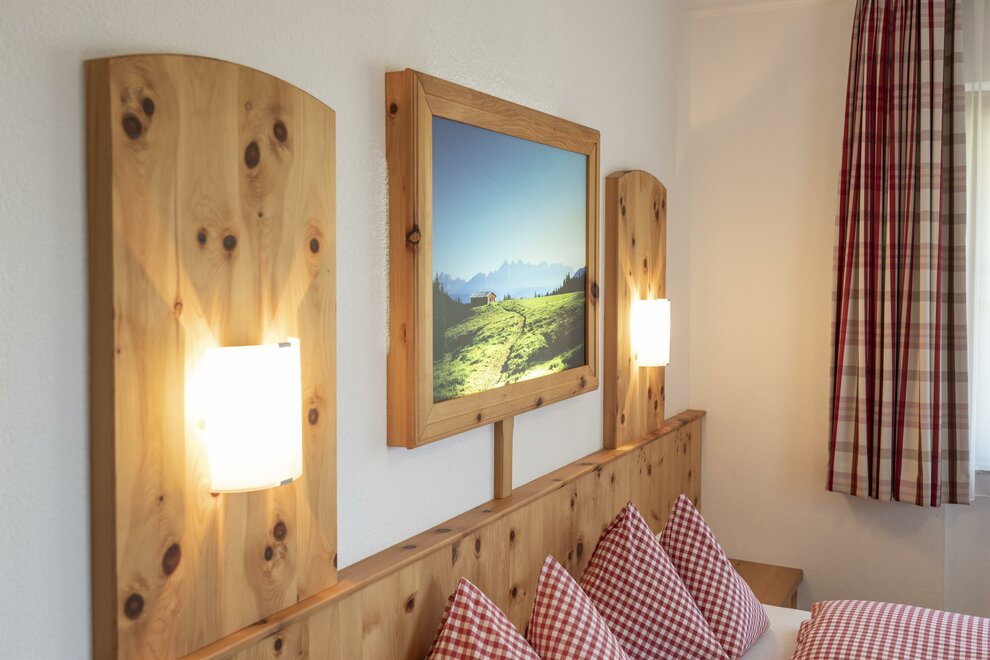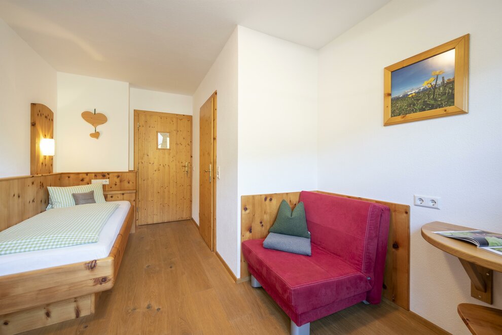 Gemütliches Einzelzimmer mit Balkon. Ausgestattet mit Parkettboden, Zirbenholz Einrichtung, modernes Bad mit Dusche, WC und Föhn, TV und W-Lan.