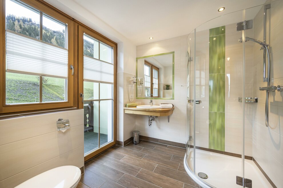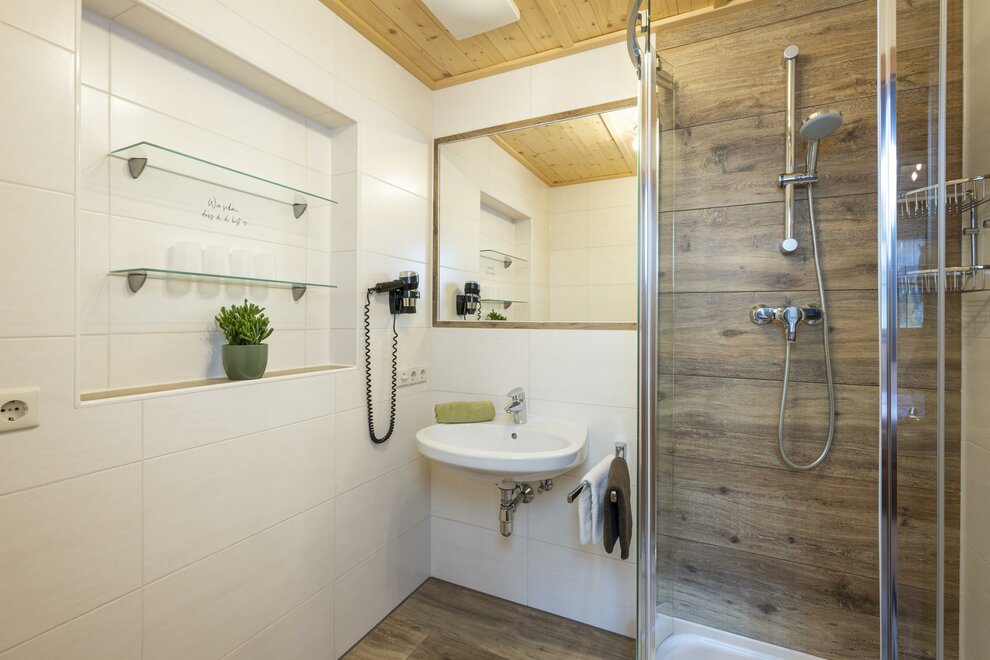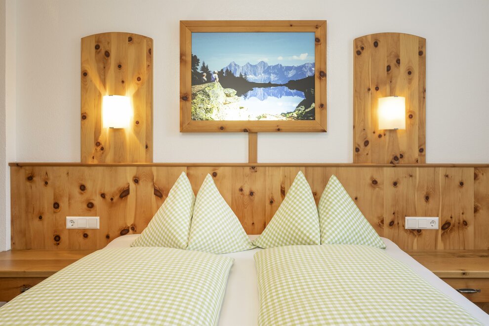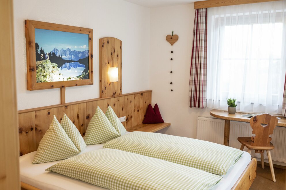 Gemütliches Doppelzimmer mit Balkon oder Terrasse. In jedem Zimmer Parkettboden, Zirben- oder Fichtenholz Einrichtung, modernes Badezimmer mit Dusche, WC und Föhn, TV und W-Lan.
