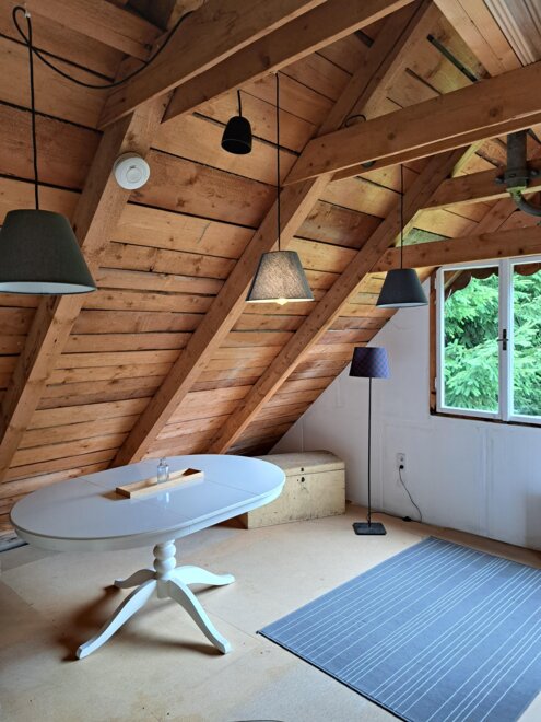 Die Zimmer verteilen sich auf drei Stockwerke, das dritte Schlafzimmer ist über einen nicht ausgebauten Dachbodenteil zu erreichen.