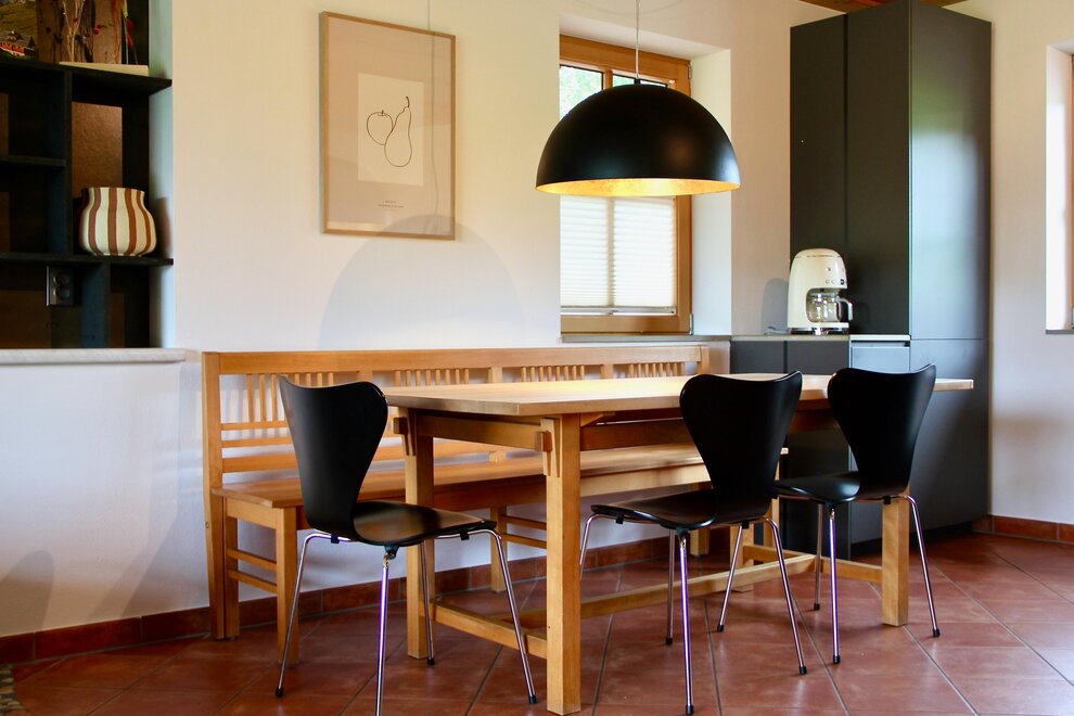 Die geräumige, komplett ausgestattete Wohnküche (Kaffeemaschine, Teekocher, Geschirrspülmaschine) verfügt über einen großen Esstisch mit Eckbank. TV, Radio und gratis WiFi darf natürlich auch nicht fehlen.