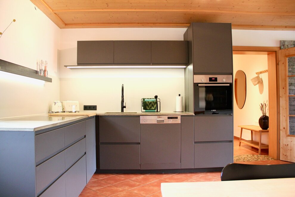 Unser ebenerdiges Appartment (für zwei bis vier/fünf Personen) umfasst eine große Wohnküche, die zum gemütlichen Zusammensitzen und Kochen einlädt. Die Küche ist komplett ausgestattet mit Kaffeemachine, Teekocher und Geschirrspülmaschine.