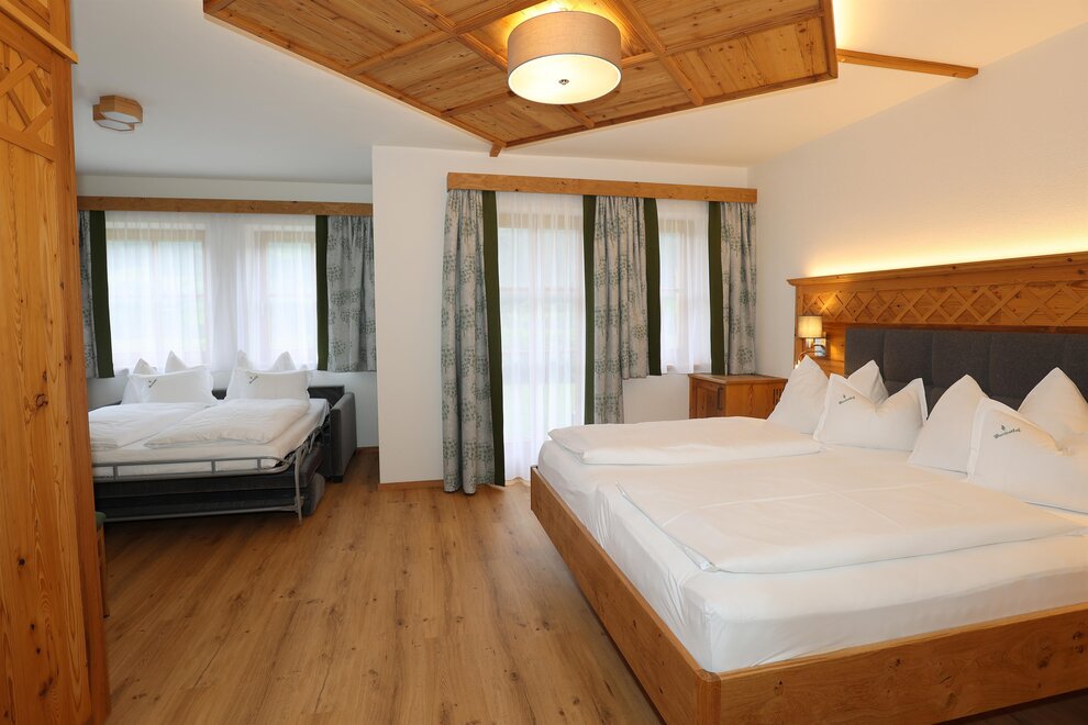 große und freundliche Nichtraucher-Familienzimmer mit 2 getrennten Schlafzimmern und Vorraum mit Garderobe, gemütlicher Sitzecke, Dusche/WC und Balkon, Flat-TV und gratis W-Lan