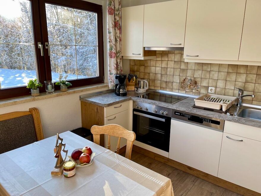 Balkon, Kachelofen, Geschirrspülmaschine, Kabelfernsehen, Elektroherd, Küche, Geschirrspülbecken