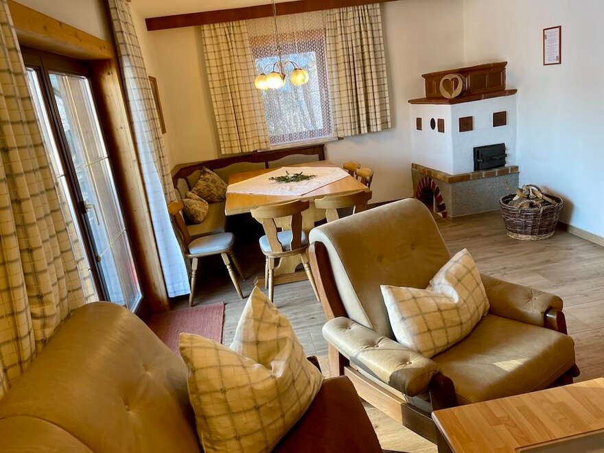 Im Erdgeschoss erwartet Dich ein einladendes Wohn-/Esszimmer mit einem gemütlichen Kachelofen.