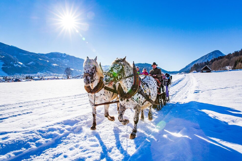 Wintersportbegeisterte kommen bei uns ebenfalls voll auf ihre Kosten. Nur 7 Autominuten von unserer Ferienwohnung Madelaine entfernt befindet sich der östliche Ersteinstieg in die Schladminger 4-Berge-Skischaukel – unser Skiberg Hauser Kaibling. Für Langlauffreunde empfehlen wir Ramsau am Dachstein, dieses Sonnenplateau ist in 10 Autominuten erreichbar. Winterwanderungen und Pferdeschlittenfahrten können ab unserem Haus unternommen werden. Im näheren Umkreis finden Sie zudem noch die Rodelbahnen auf der Hochwurzen (Rohrmoos) und Galsterberg (Pruggern). Sie sehen, auch im Winter ist für viel Abwechslung gesorgt in der heimischen Bergwelt der Schladminger Tauern und des Dachstein Massivs.