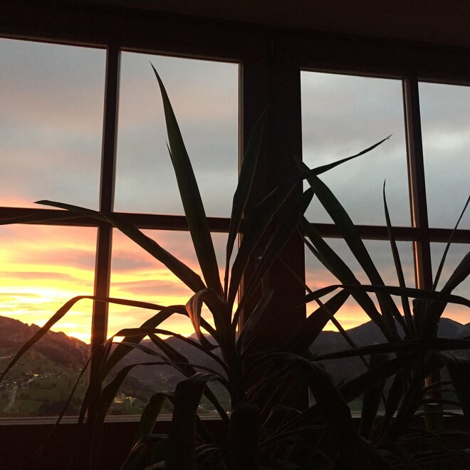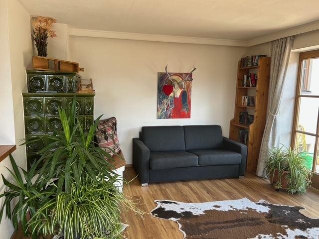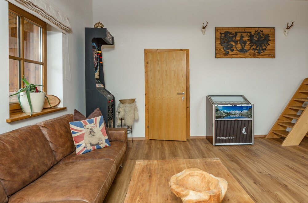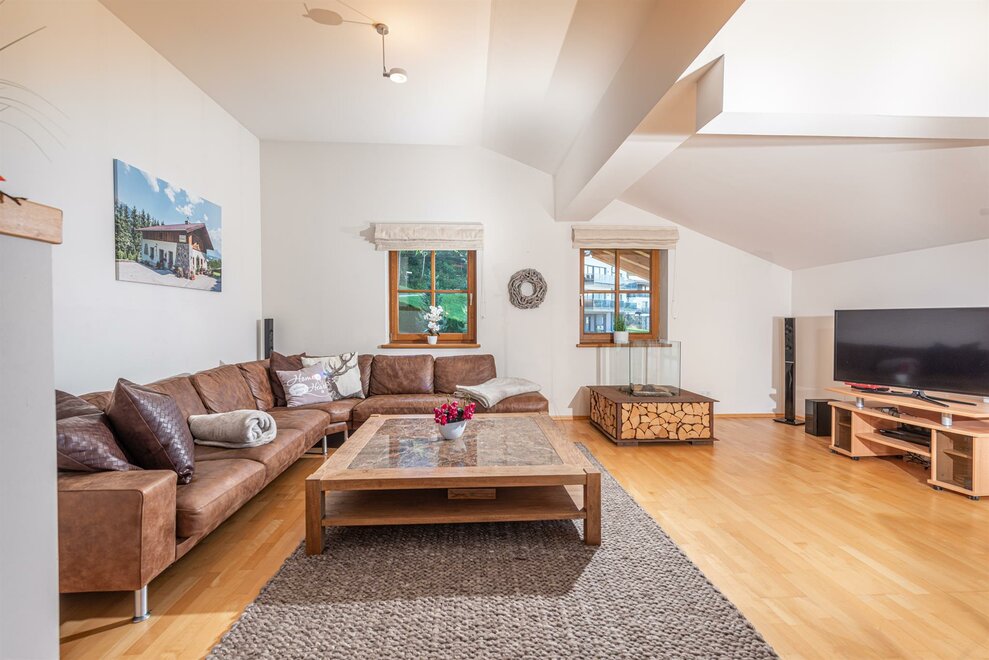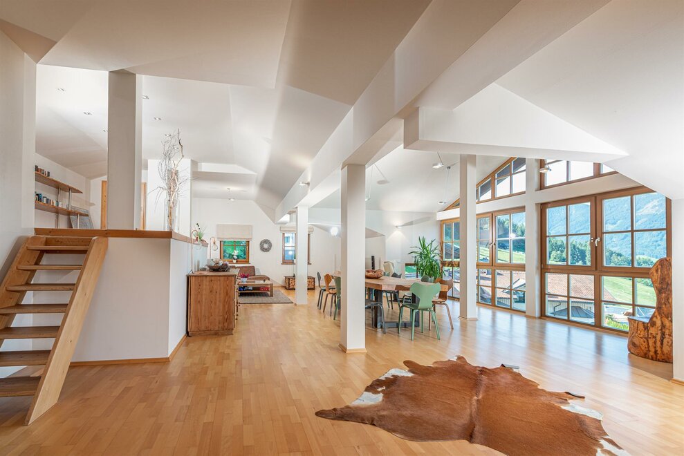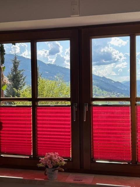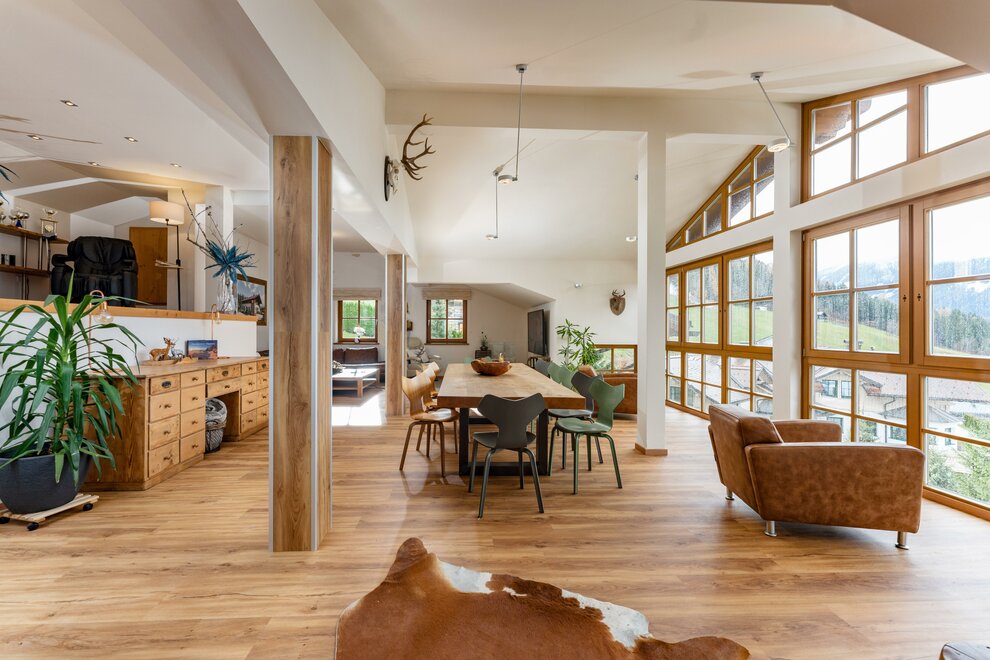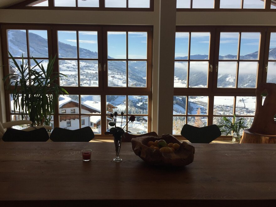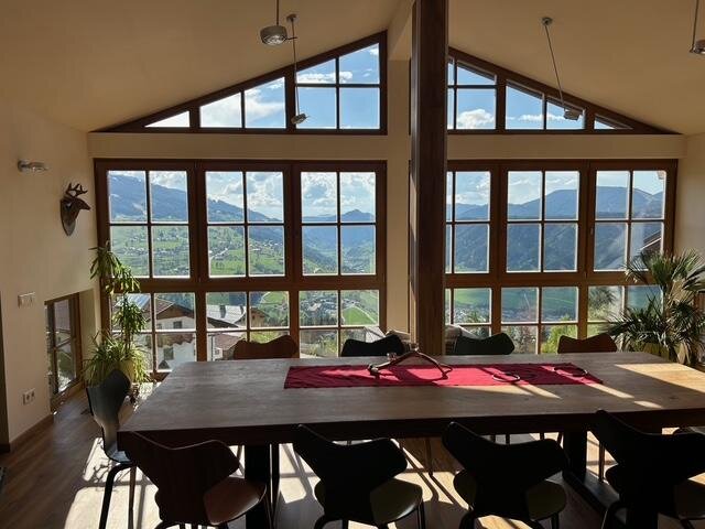 1 großer Aufenthaltsraum mit Esstisch ,Kühlschrank und einzigartiger Aussicht über Schladming!