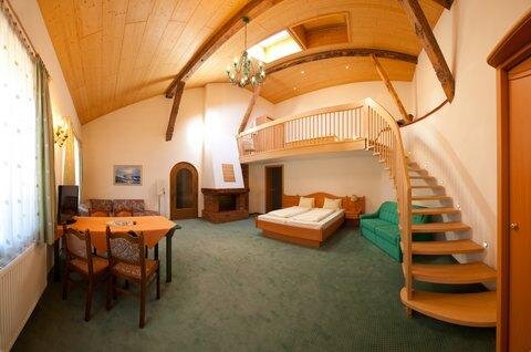 Hotelsuite "Dachsteinblick" for 4 to 6 people 1 big living room with double-bed, 1 double bed at the gallery, 1 separate room with double bed. separate bath and toilet 68m²/kitchen, shower/WC, Tel./TV, Radio.
