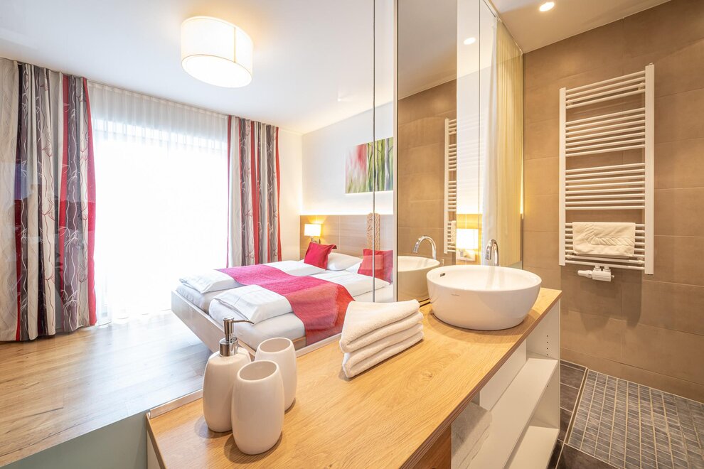 Großzügige und freundlich helle Suiten/Familienzimmer warten auf Sie. Unsere Suiten/Familienzimmer sind bestens ausgestattet: Wohn- und Schlafraum getrennt, Dusche und WC getrennt, Fön, Flat-TV, W-Lan, Sitzgelegenheit und ein Balkon machen Ihre Urlaub zum Traumurlaub. Größe der Zimmer: ca. 44m²