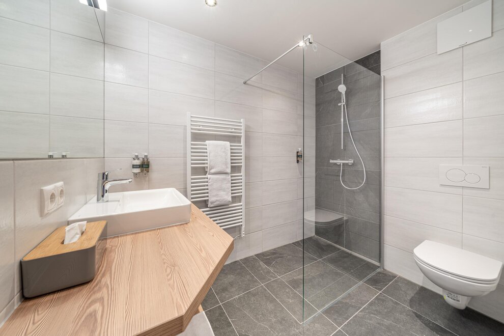 mit 2 Balkonen: einer mit herrlichem Dachsteinpanorama, der 2. Balkon nach Osten oder WestenSanitäre Ausstattung