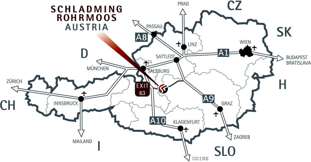 Bahnhof Schladming, 2 km / Flughafen Salzburg, 90 km / Seilbahn Planai, 500 m
