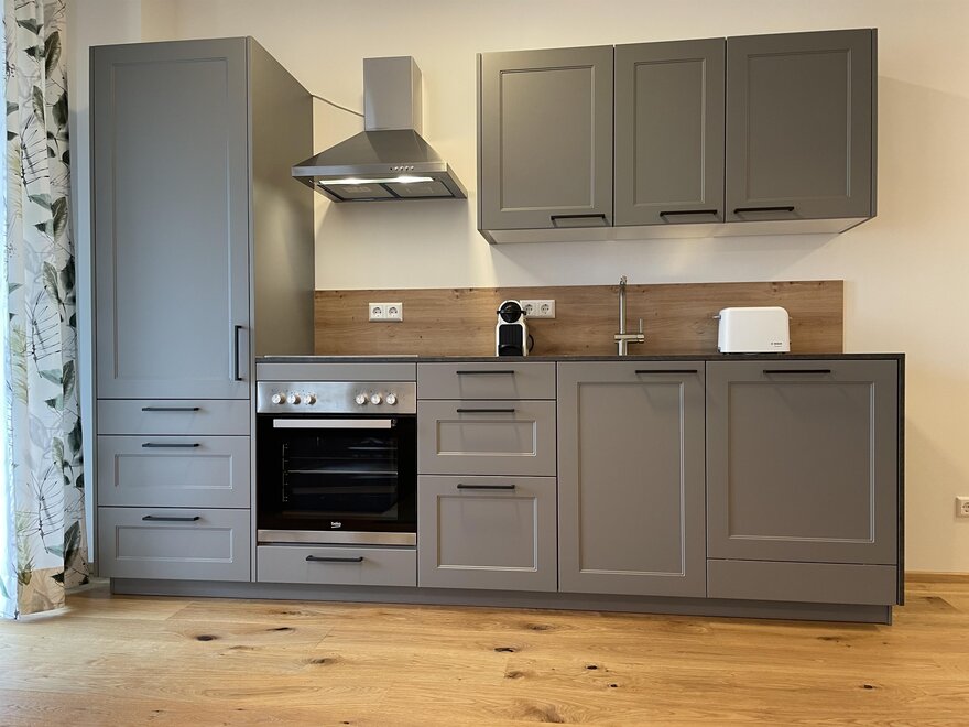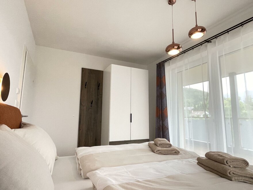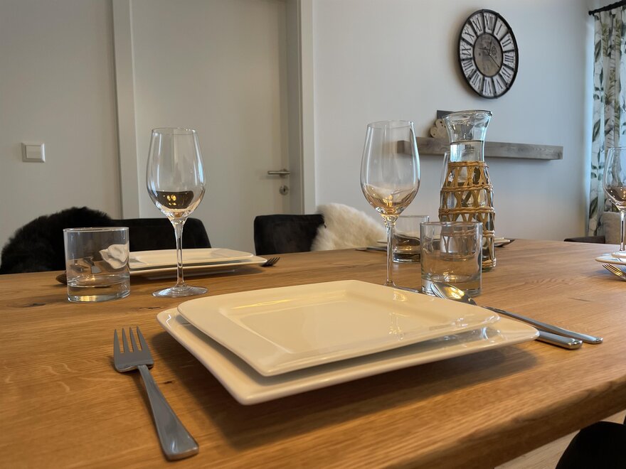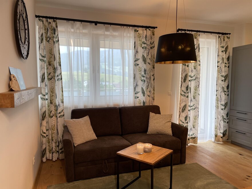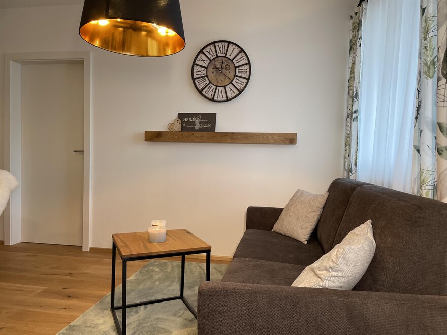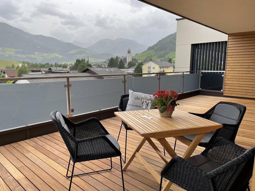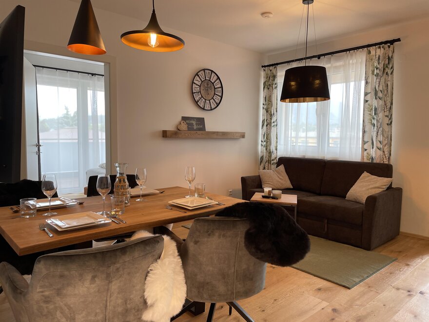 Mit seinem rustikal modernen Charme biete das Apartment eine gemütliche entspannende Atmosphäre. Einen wunderschönen Ausblick auf die Berge haben sie auf der großzügigen Terrasse.