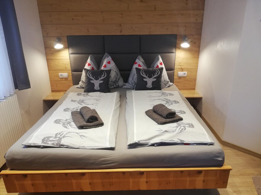 Unsere Ferienwohnung *Grimmingblick* bietet Platz für 4 Personen. Sie verfügt über 2 Schlafzimmer, (1 Doppelbett Zimmer und 1 Kinderzimmer mit 2 Einzelbetten)mit TV, 1 Badezimmer mit Dusche, 1 WC und einer Küche mit Balkon.