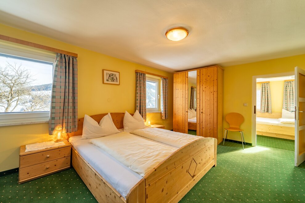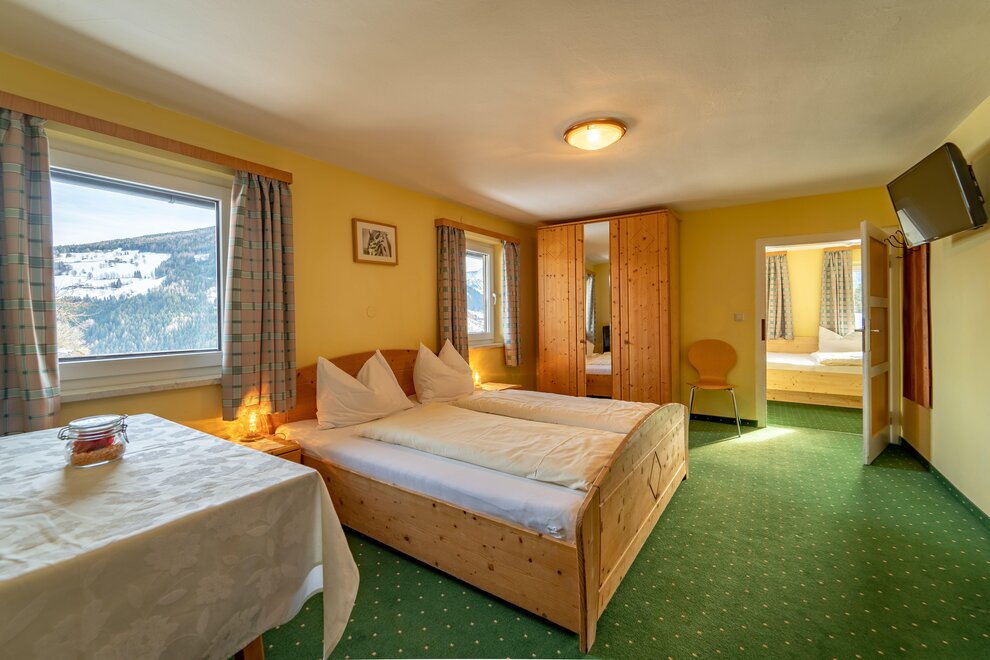 Für Familien steht ein großzügiges Familienzimmer zur Verfügung, bestehend aus zwei Doppelzimmern, die durch eine Verbindungstür verbunden sind, sowie einem gemeinsamen Badezimmer mit Dusche und WC.Ausstattung Zimmer/Appartement
