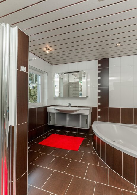 - 3. Badezimmer mit Dusche, Badewanne & Waschtisch im EG - Gesamt 8 Parkplätze, davon 2x Garagenparkplätze, 2x direkt vor dem Haus & 3x Parkplätze 50m entfernt vom Haus direkt vor dem Garten