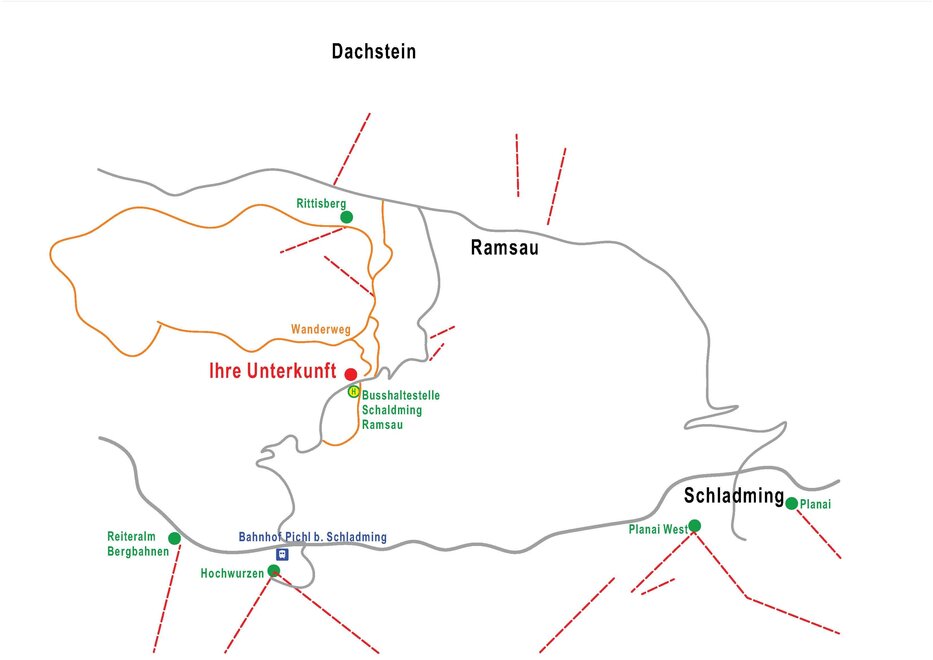 Von Deutschland über Salzburg bis Ausfahrt Knoten Ennstal/Graz auf der Autobahn (A 10), dann 18 km Bundesstraße (B 320) Richtung Schladming;