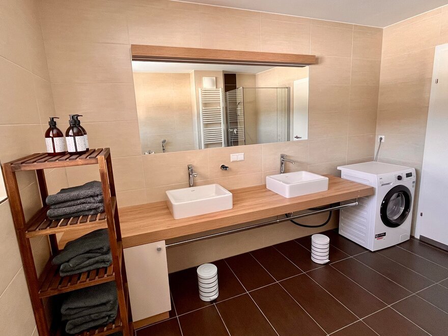 Breite Flure und Türen sorgen für ein großzügiges, barrierefreundliches Raumgefühl. Das helle Wohnzimmer mit ausziehbarer Couch führt direkt auf die große Terrasse mit traumhaftem Ausblick. Zwei Schlafzimmer mit Doppelbetten und hochwertiger Bettwäsche garantieren erholsamen Schlaf. Die voll ausgestattete Küche und das großzügige Bad mit Dusche, Badewanne und Waschtrockner bieten höchsten Komfort. Schnelles WIFI und viel Stauraum runden das Angebot ab. Hier kann man sich rundum wohlfühlen und jeden Moment genießen.Sanitäre Ausstattung
