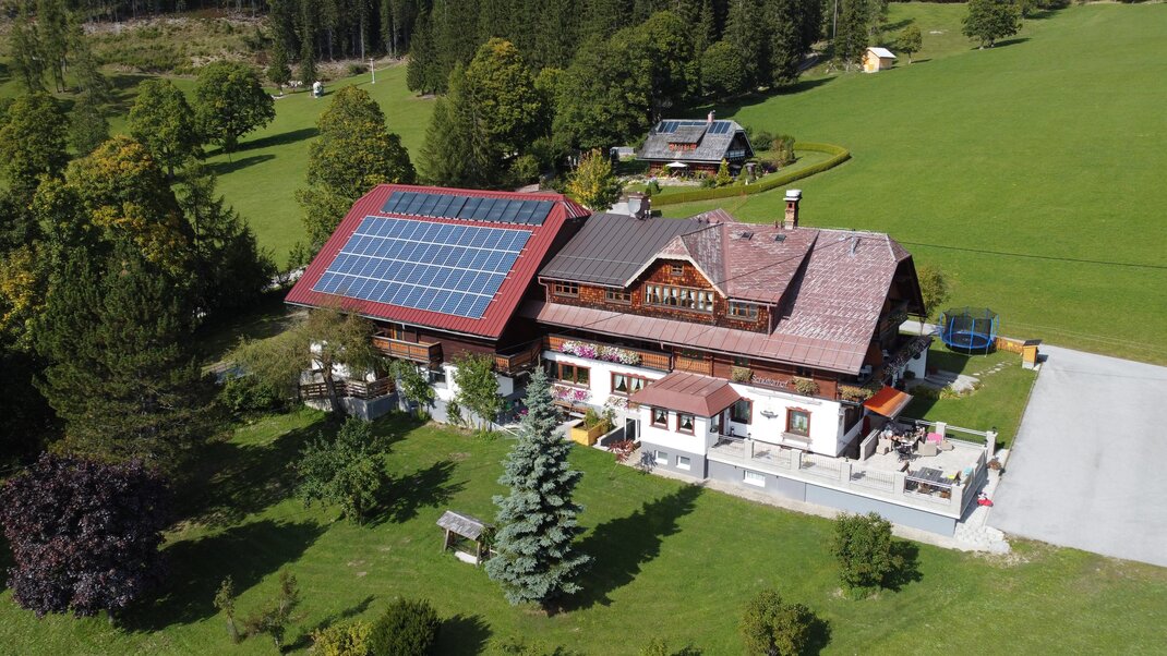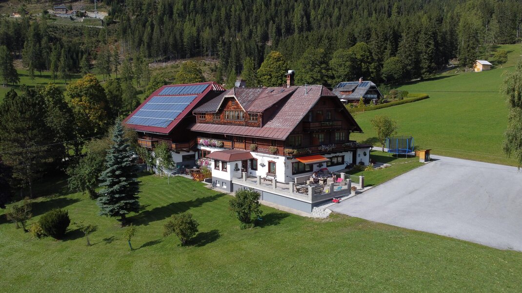 Pension mit Zimmer und Appartements in herrlicher Lage. 1600 m² große Gartenanlage, Kinderspielplatz, Schaukel, etc. Direkt am Wanderweg ins Almgebiet, zum Badesee und Freizeitpark nur 5 min zu Fuß. Im Winter direkt vom Bett auf die Piste und nur unweit zu den Loipen. Appartements für 2 - 6 Personen, komplett eingerichtet. Der Bauernhof ist umgeben von den eigenen Wiesen und Wäldern.