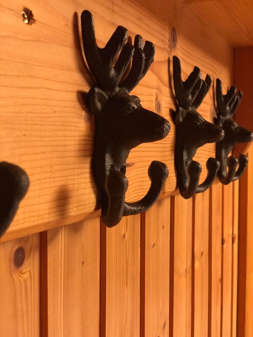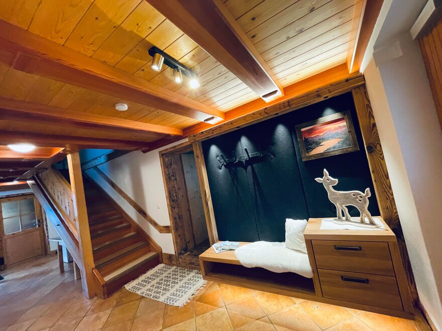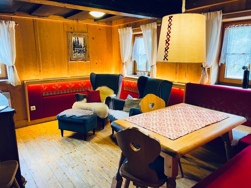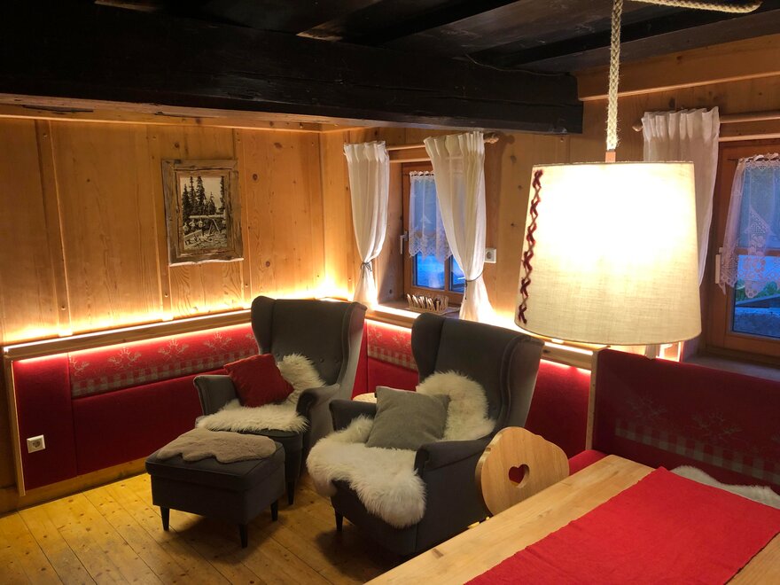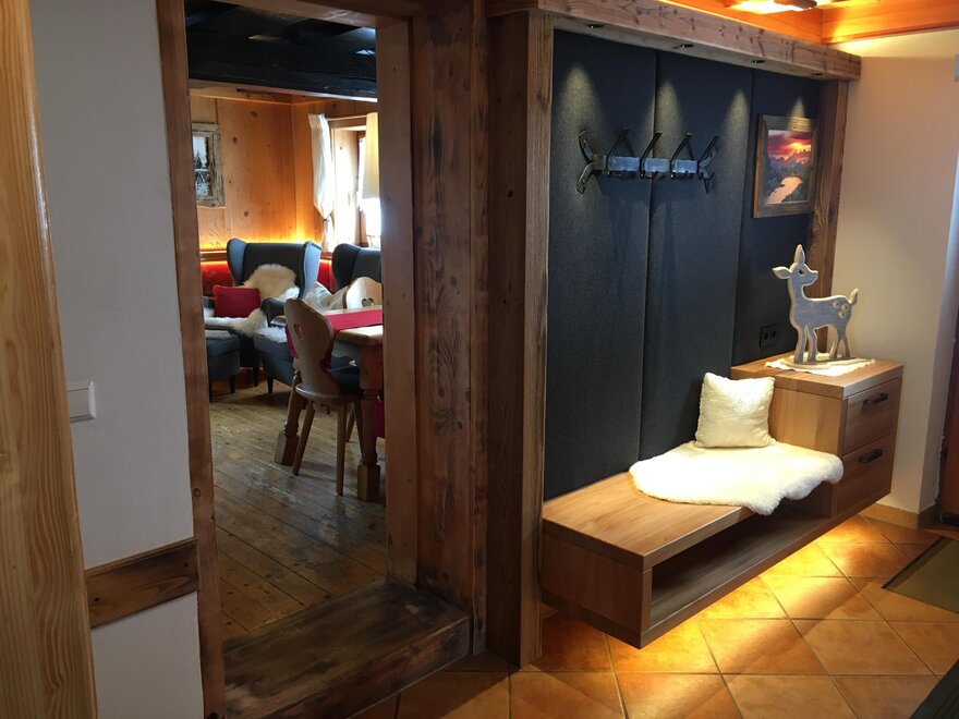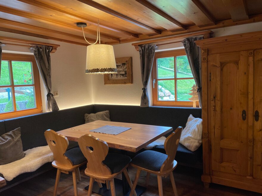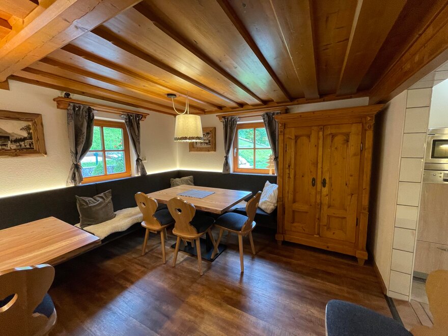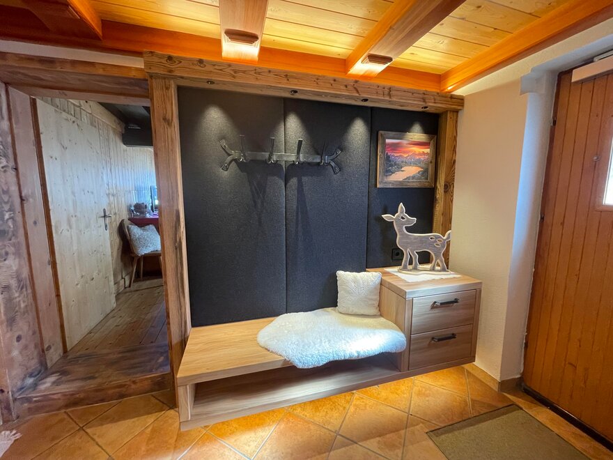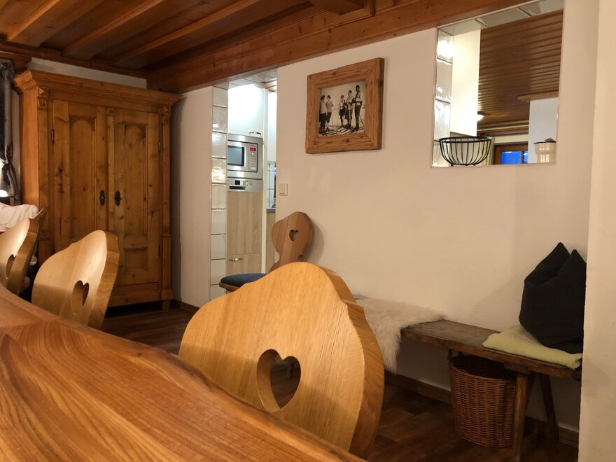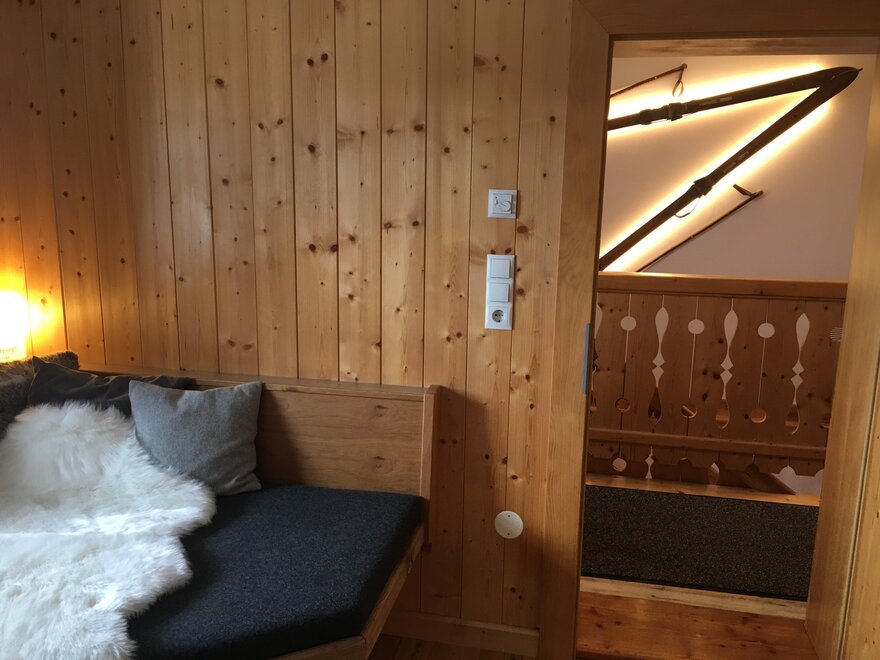 Im Erdgeschoss: eine voll ausgestattete Küche, extra Speisekammer, eine großen Stube, eine kleine Stube inkl. TV, einem Vorraum, 2 seperaten Toiletten, 1 Abstellraum (Müll), einen mit Code verschließbaren Schiraum, Garderobe und Schuhtrockner