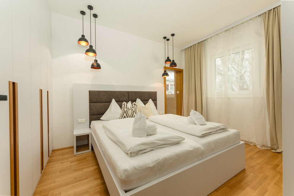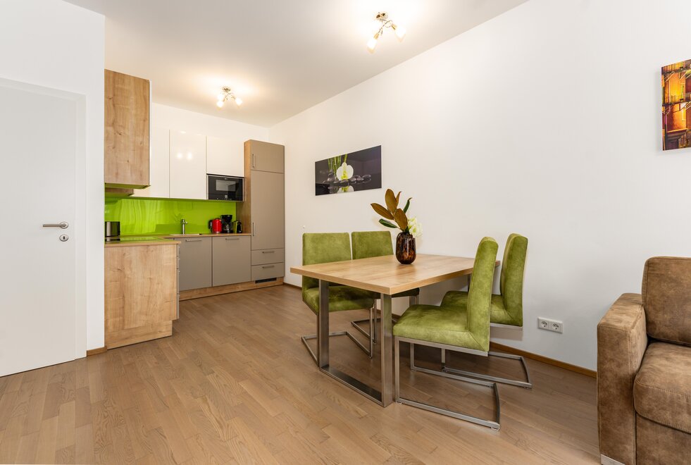 Top 2: 60 m² App. im Erdgeschoss für 2-4 Personen, voll ausgestattete Wohnküche mit Esstisch, Schlafsofa für 2 Personen und TV, 40 m² Terrasse mit Lounge- und Gartenmöbel, ein separates Schlafzimmer mit Doppelbett und TV, ein Badezimmer mit Dusche, eine separate Toilette, 1x Tiefgaragenparkplatz.