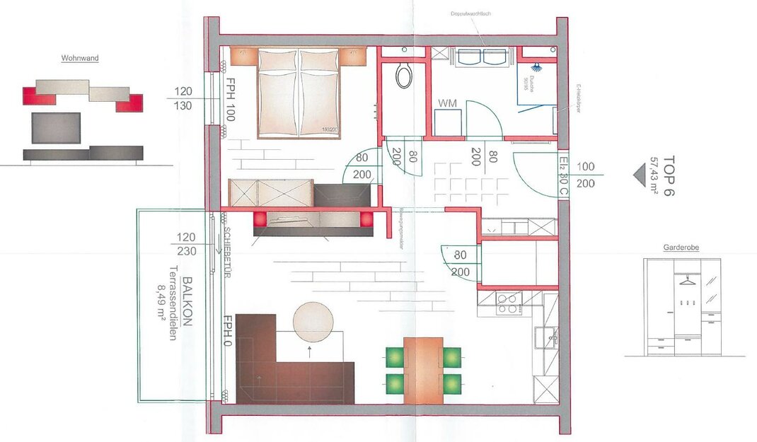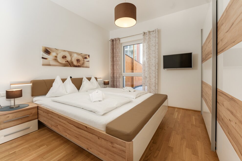 Top 6: 57 m² App. im 1. Obergeschoss für 2-4 Personen, hochwertige, voll ausgestattete Wohnküche mit Esstisch, Schlafsofa für 2 Personen und TV, 9 m² Balkon mit Balkonmöbel, ein separates Schlafzimmer mit Doppelbett und TV, ein Badezimmer mit Doppelwaschtisch, Dusche, eine separate Toilette, 1x Tiefgaragenparkplatz.