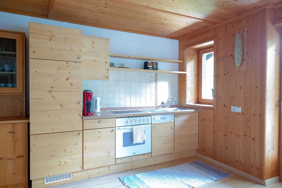 Holzboden, vollständig ausgestattete Küche mit Geschirrspüler, Essecke, komfortable Couch die sich ausziehen lässt und für 2 weitere Personen Platz bietet.